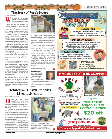 The Story of Rose’s HouseBWy Sonny Melendrezhat began as a simple act of kindness has blossomed into a life of profound purpose for Philand Pat Gonzales in Northwest San Antonio. When their next-door neighbor, Rose Hamilton, suffered an illness that was diagnosed with pancreatic cancer and no family by her side, Phil accompanied Rose to the hospital in the ambulance, offeringthe comfort of a friend in her time of need. From that moment on, the Gonzaleses became Rose’s caretakers, helping her with doctor visits, grocery shopping, and providing steady, loving support. Their bond grew stronger as they walked with herthrough some of life’s toughest moments. After Rose passed away, her grown children awarded the sale of her home to Phil and Pat. Instead of selling it for personal gain, the couple chose to transform it into ahaven for others.Ironically, the purchase was made amonth before Pat’s own breast-cancer diagnosis. (After successful surgeries, with Phil’s unwavering support, she is now a survivor.)Using his skills as a property manager and handyman, Phil worked to renovate Rose’s home and offer it, for an affordable fee, to cancer patients and their families traveling to San Antonio for treatment.As word of the couple’s selfless project spread, donations of furniture, appliances, and other essentials poured in from generous donors.Now, three years later, Rose’s House has welcomed over 65 guests and their caregivers, from as far away as British Columbia, Hawaii, California, and many states across the U.S., offering them not just shelter, but a peaceful, private, little house of healing.GYM LogisticsTuesdays and Thursdays • 9am-2pm Annual Registration - $50Annual Supply Fee- $50 • Monthly Tuition -$265Primary GoalThe Goal at Powerhouse is to instill a lifelong love of learning in their students. Each child will safely learn a variety of cognitive, social motor and lingua skills while in our program.RequirementsAges 2.5 -5 years (must be potty trained) a backpack with a water, lunch and change of clothes is a must to be brought to each class.(210) 767-96547707 W Loop 1604 NSan Antonio, TX 78254 powerhousetntgymnastics.comIF IT BUGS YOU... IT BUGS APPLE!!!MOTHER’S DAY OUTHelotes 4-H Barn Buddies Livestock ShowEST. 1984 Honesty & DependabilityYES! ORGANIC SERVICES NO EXTRA CHARGE!NO! CONTRACTSEndorsed by DAVE RAMSEYTry Our Wallet Friendly Organic Pest Control ServiceHSubmitted By Helotes 4Helotes 4-H Barn Buddies Livestock Show is a unique opportunity for special needsstudents to experience showing an animal, connect with peers, and learn a little about agriculture.Participants will be paired with buddies from Helotes 4–H. These show buddies will share about how to care for their lamb or goat, including feeding, grooming, and preparing for a show. The buddies will then step into the show ring and participate in a lamb and goat show!The show is open to all special needs children in grades 1-12 who are interested in agriculture and participating in a livestock show. This event is free to participants and a complimentary lunch will be provided. Participants must be pre-registered byOctober 12. Call (210) 695-2772. Saturday, October 19, 2024 10am - 1pm The Helotes 4-H Activity Center12132 Leslie Road, Helotes TX 78023Quotes by Phone(210) 695-8946Family Owned & Operatedwww.ApplePestControl.comOctober 2024www.heloteshighlights.com 5A recent entry in the “Warrior’s Journal” by a grateful cancer patient captures the spirit of Rose’s House-- “I don’t look back on my surgery and those ten days with fear or resentment. I think of how welcoming that home was during the hardest time of my life.”Phil and Pat Gonzales’ story is one of ordinary people doing extraordinary things, proving that the power of compassion can transform lives. What started as a kindhearted gesture to a neighbor has become a legacy of love, not just for Rose Hamilton but for the many lives touched by Rose’s House. Their unwavering commitment reminds us all that the greatest impact often begins with the smallest of acts—a truth that continues to inspire those fortunate enough to cross their path.For more information, visit: www.RosesHouseLLC.comSonny Melendrezis an award-winningmotivational speaker,Hall of Fame radio/TV host and author,based in San Antonio.For more of his enthusiastic brand of inspiration and speaking information, visit www.SonnyMelendrez.com and listen to his podcast.