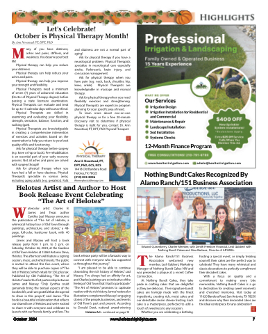 Our ServicesIrrigation DesignIrrigation Installation for Residentialand Commercial Maintenance & RepairLandscape Installation Sod Installation Systems Checks12-Month Finance Program www.benitezirrigation.com admin@benitezirrigation.comLet’s Celebrate!October is Physical Therapy Month!By Ann Newstead PT, DPT, PhDM any of you have dizziness, aches and pains, stiffness, andweakness. You deserve your bestlife!Physical therapy can help you reduceyour dizziness.Physical therapy can help reduce youraches and pains.Physical therapy can help you improveyour strength and flexibility.Physical Therapists need a minimumof seven (7) years of advanced education (Doctor of Physical Therapy degree) before passing a state licensure examination. Physical Therapists can evaluate and treat for up to 15 calendar days without a referral.Physical Therapists are skilled in examining and evaluating your flexibility, strength, sensation, balance, function, and walking (gait).Physical Therapists are knowledgeable in creating a comprehensive intervention of exercises and activities based on the examination to help you return to your best quality of life and functioning.Ask for physical therapy before surgery (e.g. knee or hip or back). Pre-rehabilitation is an essential part of your early recovery process. Not all aches and pains are solved with surgery though!Ask for physical therapy when you have had a fall or have dizziness. Physical Therapists specialize in various areas, including aging adults (e.g. geriatrics). Fallsand dizziness are not a normal part of aging!Ask for physical therapy if you have a neurological problem. Physical Therapists specialize in neurological care especially stroke, Parkinson’s, brain injury, and concussion management.Ask for physical therapy when you have pain (e.g. neck, back, shoulder, hip, knee, ankle). Physical Therapists are knowledgeable in massage and manual therapy.Ask for physical therapy when you need flexibility exercises and strengthening. Physical Therapists are experts in program planning for your specific area of need.To learn more about one-on-one physical therapy or for a free 20-minute Discovery visit to determine if physical therapy is right for you, contact Dr. Ann Newstead, PT, DPT, PhD Physical Therapist.Ann H. Newstead, PT, DPT, PhD, GCS, NCS 14418 Old Bandera Road Helotes, TX 78023(210) 833-8336Ahnewphysicaltherapy.comNothing Bundt Cakes Recognized By Alamo Ranch/151 Business AssociationEdward Quisenberry, Charter Member, with Zenith Freedom Financial, Lesli Gabbert with T NothingBundtCakesandGinaBarbera,DirectorofAR151BA.he Alamo Ranch/151 Business hosting a special event, or simply treating Association welcomed new yourself, their cakes are the perfect way to member, Lesli Gabbert, Marketing celebrate! They have many whimsical andHelotes Artist and Author to Host Book Release Event CelebratingW “The Art of Helotes”atercolor artist Charles B. James and Texas author Cynthia Leal Massey announcethe publication of “The Art of Helotes, a whimsical history tour of Old Town through paintings, architecture, and stories,” a 48- page, full-color, hardcover book, with 40 paintings.James and Massey will host a book release party from 1 p.m. to 3 p.m. on Saturday, October 26, 2024, at the Gardens at Old Town Helotes at 15060 Antonio Drive, Helotes. The afternoon will feature a signing session, music, and refreshments. The public is invited to attend this free event, where they will be able to purchase copies of “The Art of Helotes,” which retails for $30, plus tax. Published by CBJ Publishing, “The Art of Helotes”marks the first partnership between James and Massey. “Only Cynthia could genuinely bring the textual aspects of the book to life, and I am grateful that she agreed to share in this project,” said James. “This book is a beautiful collaboration that reflects our shared love of Helotes and we’re excited to share it with everyone and celebrate its launch with our friends, family, and fans. TheOctober 2024book release party will be a fantastic way to connect with everyone who has supported us throughout this journey.”“I am pleased to be able to continue chronicling the rich history of Helotes,” said Massey. “I’ve always had an affinity for art, and Charles’paintings are so indicative of the feeling of Old Town that I had to participate.” “The Art of Helotes” promises to captivate readers with its rich history. James’watercolor illustrations complement Massey’s engaging stories of the people, businesses, and events of Old Town’s past and present. According to Donald Darst, national award-winningManager of Nothing Bundt Cakes NW and was presented a plaque at a recent Coffee Connection.At Nothing Bundt Cakes, they take pride in crafting cakes that are delightful as they are delicious. Their signature bundt cakes are lovingly made with the finest ingredients, creating rich, moist cakes and our delectable cream cheese frosting. Each cake is a masterpiece, perfected to add a touch of sweetness to any occasion.classic decorations to perfectly compliment their decadent cakes.With a focus on quality and a commitment to making every bite memorable, Nothing Bundt Cakes is a go to destination for creating sweet moments and cherished memories. Visit today at 11620 Bandera Road San Antonio, TX 78250 and discover why their decorated cakes are the ideal centerpiece for any celebration!7Helotes Art - continued on page 10 www.heloteshighlights.comWhether you are celebrating a birthday,