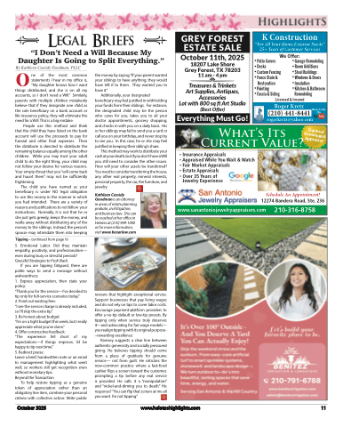Legal Briefs“I Don’t Need a Will Because My Daughter Is Going to Split Everything.”OBy Kathleen Cassidy Goodman, PLLCne of the most common statements I hear in my office is, “My daughter knows how I wantthings distributed, and she is on all my accounts, so I don’t need a Will.” Similarly, parents with multiple children mistakenly believe that if they designate one child as the sole beneficiary on a bank account or life insurance policy, they will eliminate the need for a Will. This is a big mistake.People use this method and think that the child they have listed on the bank account will use the proceeds to pay for funeral and other final expenses. Then the distribute is directed to distribute the remaining balance equally among the other children. While you may trust your adult child to do the right thing, your child may not follow your desires for various reasons. Your empty threat that you “will come back and haunt them” may not be sufficiently frightening.The child you have named as your beneficiary is under NO legal obligation to use this money in the manner in which you had intended. There are a variety of reasons and justifications to not follow your instructions. Normally, it is not that he or she just gets greedy, keeps the money, and walks away without distributing any of the money to the siblings. Instead, the person’s spouse may intimidate them into keepingTipping - continued from page 105. Emotional Labor. Did they maintain empathy, positivity, and professionalism— even during busy or stressful periods? Graceful Strategies to Push BackIf you are tipping fatigued, there are polite ways to send a message without awkwardness:1. Express appreciation, then state your policy:“Thank you for the service—I’ve decided to tip only for full-service scenarios today.”2. Point out existing fees:“I see the service charge is already included, so I’ll skip the extra tip.”3. Be honest about budget:“I’m on a tight budget this week, but I really appreciate what you’ve done.”4. Offer constructive feedback:“The experience fell short expectations—if things improve, I’d be happy to tip next time.”5. Redirect praise:Leave a brief, handwritten note or an email to management highlighting what went well, so workers still get recognition even without monetary tips.Beyond the TransactionTo help restore tipping as a genuine token of appreciation rather than an obligatory line item, combine your personal criteria with collective action: Write publicOctober 11th, 2025 18207 Lake Shore Grey Forest, TX 78203 s11 am - 4 pmTreasures & TrinketsArt Supplies, Antiques, AccessoriesLot with 800 sq ft Art Studio (Best Offer)K Construction“For All Your Home Exterior Needs” 25+ Years of Customer ServicesGREY FOREST ESTATE SALE• Patio Covers• Decks• Custom Fencing • Fence Stain &Restoration• Painting• Fascia & Siding• Garage Remodeling • Room Additions• Steel Buildings• Windows & Doors • Insulation• Kitchen & Bathroom RemodelingWe Offer:Licensed & InsuredRoger Kretz Watch Me(210) 441-8441rogerkretz@yahoo.comOnEverything Must Go!What’s Its Current Value?• Insurance Appraisals• Appraised While You Wait & Watch • Fair Market Appraisals• Estate Appraisals• Over 35 Years of Jewelry ExperienceSchedule An Appointment!12274 Bandera Road, Ste. 236www.sanantoniojewelryappraisers.com210-316-8758of mythe money by saying, “If your parent wanted your siblings to have anything, they would have left it to them. They wanted you to have it.”Additionally, your designated beneficiary may feel justified in withholding your funds from their siblings. For instance, the designated child may be the person who cares for you, takes you to all your doctor appointments, grocery shopping, and checks in with you on a daily basis. His or her siblings may fail to send you a card or call you on your birthday, and never stop by to see you. In this case, he or she may feel justified in keeping their sibling’s share.This method may work to distribute your cash at your death, but if you don’t have a Will you still need to consider the other issues. How will your other assets be transferred? You need to consider transferring the house, any other real property, mineral interests, personal property, the car, the furniture, and jewelry.Kathleen Cassidy Goodman is an attorney in areas of estate planning, probate, civil litigation, and business law. She can be reached at her office in Helotes at (210) 949-1000 or for more information, visit www.bexarlaw.comreviews that highlight exceptional service. Support businesses that pay living wages and do not rely on tips to cover labor costs. Encourage payment-platform providers to offer a no-tip default or low-tip presets. By tipping only when service truly deserves it—and advocating for fair wage models— you realign tipping with its original purpose- --rewarding excellence.Ramsey suggests a clear line between authentic generosity and socially pressured giving. He believes tipping should come from a place of gratitude for genuine service— not from guilt. He criticizes the now-common practice where a fast-food cashier flips a screen toward the customer, prompting a tip before any real service is provided. He calls it a “manipulation” and “nickel-and-diming you to death.” His response? “You can flip that screen at me all you want. I’m not tipping.”October 2025www.heloteshighlights.com 11RegisteredGemologist Appraiser