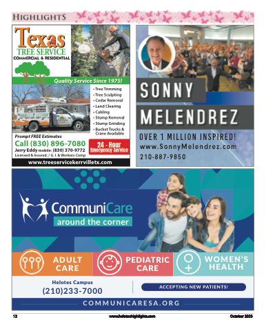 Quality Service Since 1975!• Tree Trimming• Tree Sculpting• Cedar Removal• Land Clearing• Cabling• Stump Removal• Stump Grinding• Bucket Trucks & Crane Available24 - Hour Emergency Servicewww.treeservicekerrvilletx.comaround the cornerPEDIATRIC CARE CAREPrompt FREE EstimatesOVER 1 MILLION INSPiRED!www.SonnyMelendrez.com 210-887-9850Call (830) 896-7080Jerry Eddy mobile: (830) 370-9772Licensed & Insured. / G. I. & Workers Comp12www.heloteshighlights.comOctober 2025ADULTWOMEN’S HEALTHHelotes Campus(210)233-7000ACCEPTING NEW PATIENTS!COMMUNICARESA.ORG