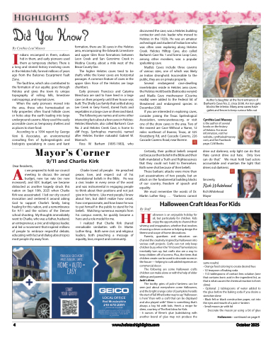 Did You Know?formation, there are 36 caves in the Helotes area, encompassing the Edwards Limestone and upper Glen Rose formations between Leon Creek and San Geronimo Creek in Medina County, about a mile west of the Bexar County line.The higher Helotes caves tend to be shafts while the lower caves are horizontal passages. A common feature of caves in the upper Glen Rose of the Helotes are large chambers.Early pioneers Francisco and Catarina Menchaca are said to have lived in a large cave on their property until their house was built. The Shelly Lee family that settled along Lee Creek in Grey Forest, stored fruits and vegetables in a large cave on their ranchland.The following are names and some other interesting facts about a few caves in Helotes: Helotes Blowhole, also called Barham’s Cave No. 2 and Helotes Creek Cave, is home to cliff frogs, Syrrhophus marnockii, named after Helotes frontier naturalist Gabriel W. Marnoch.Ross W. Barham (1895-1983), whodiscovered the cave, was a Helotes building contractor and civic leader who moved to Helotes in the 1920s. He was an amateur archeologist and student of Indian lore who was often seen exploring along Helotes Creek. Helotes Hilltop Cave, also called Barham’s Cave No. 1 and Scenic Loop Cave, among other monikers, was a popular spelunking cave.Madla’s Caves include three caverns of various sizes, one of which was likely an Indian stronghold. Inaccessible to the public, they are on private property.Several endangered cave-dwelling invertebrates reside in Helotes area caves: the Helotes mold beetle (Batrisodes venyivi) and Madla Cave meshweaver (Cicurina madla) were added to the Federal list of threatened and endangered species in December 2000.If you are interested in exploring caves, consider joining the Texas Speleological Association, www.cavetexas.org, or visit one of the show caves in the area. Two of the nearest are Cave Without a Name, 12 miles northeast of Boerne, Texas, at 325 Kreutzberg Rd, and Cascade Caverns, 226 Cascade Caverns Road, near Boerne.Certainly, their political beliefs seeped out because their belief in the Bible and their faith mandated a Truth and Righteousness that they could not hold to themselves. Both were shot because of their beliefs.These barbaric attacks were more than just assassinations of two people, but an attack on the fundamental building blocks of our country, freedom of speech and equality.We must remember the words of Dr. Martin Luther King .... “Darkness cannotIBy Cynthia Leal Masseyndians encamped in them, outlaws hid in them, and early pioneers used them as temporary shelters. There isa long and storied history involving caves in the Helotes hills, formed millions of years ago from the Balcones Escarpment Fault Zone.The fault line, which also contributed to the formation of our aquifer, goes through Helotes and gives the town its unique topography of rolling hills, limestone outcroppings, and myriad caves.When the early pioneers moved into the area, those who homesteaded on hilly properties often found hillside caves or holes atop the earth leading into large underground caverns. Many used the easily accessible caves as temporary shelters and as places to store food.According to a 1994 report by George Veni & Associates, an environmental consulting firm of hydrogeologists and biologists specializing in caves and karstAuthor’s daughter at the front entrance of Barham’s Cave No. 2, circa 2006. An iron gate blocks the interior. Many area caves have gates and fences to keep curious folks out.Cynthia Leal Masseyis the author of several books on the historyof Helotes. For more information, visit her website, cynthialealmassey. com, and her Facebook page, CLM Books.drive out darkness; only light can do that. Hate cannot drive out hate. Only love can do that.” We must hold bad actors accountable and maintain the light that drives out darkness.Sincerely,Rich WhiteheadRich Whitehead MayorMayor’s Corner9/11 and Charlie KirkADear Residents,s we prepared to hold our council meeting to discuss the annual budget, new tax rate (no new increases!), and EDC budget, we became distracted as another tragedy struck this nation on Sept 10th, 2025 when Charlie Kirk was assassinated. I led our city council invocation and centered it around asking God to support Charlie’s family, bring healing for this nation, and a remembrance for 9/11 and the victims of the Denver school shooting. My thoughts immediately went to Charlie, who was a father, husband, an entrepreneur, a civic and religious leader, and led a movement that inspired millions of people to embrace respectful debate, educating with fact and dialog about topics most people shy away from.Charlie loved all people. He preached peace, love, and respect out of his foundational beliefs in the Bible. He was a civic leader in every sense of the word and was instrumental in engaging people to think about their positions and not just give in to rhetoric. Like most people, I knew about him, but didn’t realize how smart, how compassionate, and how brave he was to put himself in the public to stand for his beliefs. Watching numerous excerpts from his campus events, he quickly became a hero and a role model for me.I realized that Charlie Kirk shared remarkable similarities with Dr. Martin Luther King. Both were civic and religious leaders, both preaching a message of equality, love, respect and community.Halloween Craft Ideas For KidsHBy Staffwhimsy and imagination, whether that involves choosing a clever costume or helping design the theme and scope of home decorations.Parents, guardians and educators can channel the creativity inspired by Halloween into various craft projects. Crafts can not only keep children busy when the“I’m bored”lamentations inevitably turn up, but crafts also are a way to keep children off of screens. Plus, the items that children create can be used to decorate rooms in the house — helping to curb added expenses on commercial d