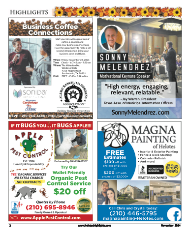 Business Coffee ConnectionsStart your day with a great cup of coffee & goodies andmake new business connections. Have the opportunity to make a 30 second introduction. Bring your business cards and flyers.When: Friday, November 22, 2024 Time: Check - in 7:45 am - 9:30 am Where: The Waterford AtWestover Hills4315 Rogers RoadSan Antonio, TX 78251Cost: FREE - Coffee & GoodiesSponsored ByASSOCIATION Building Business ConnectionsRSVP • 210-744-3488 • http://ar151ba.com/events"High energy, engaging, relevant, relatable.."~Jay Warren, President TexasAsso.ofMunicipalInformationO cersSonnyMelendrez.comwww.ar151ba.comFREE Estimates$100 off with project of $1,000 or$200 off with project of $2,000+• Interior & Exterior Painting • Fence & Deck Staining• Cabinets- Refinish• And more!VETERAN OWNEDCall Chris and Crystal today!(210) 446-5795magnapainting-Helotes.comIF IT BUGS YOU... IT BUGS APPLE!!!EST. 1984 Honesty & DependabilityYES! ORGANIC SERVICES NO EXTRA CHARGE!NO! CONTRACTSEndorsed by DAVE RAMSEYTry Our Wallet Friendly Organic Pest Control ServiceQuotes by Phone(210) 695-8946Family Owned & Operatedwww.ApplePestControl.com2 www.heloteshighlights.com November 2024HCNA/151RBUSOINMEALASSNow OfferingEPOXYFlooring!