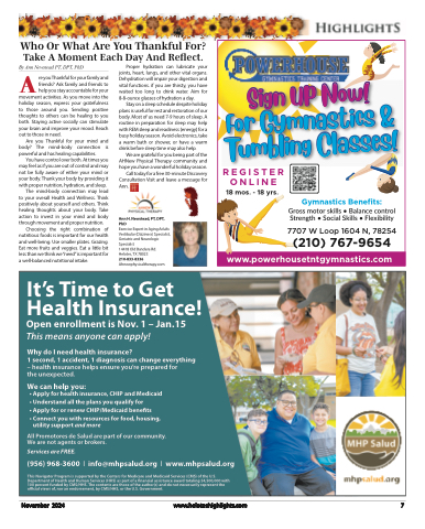 Who Or What Are You Thankful For? Take A Moment Each Day And Reflect.Proper hydration can lubricate your joints, heart, lungs, and other vital organs. Dehydration will impair your digestion and vital functions. if you are thirsty, you have waited too long to drink water. Aim for 8-8-ounce glasses of hydration a day.Stay on a sleep schedule despite holiday plans is useful for rest and restoration of our body. Most of us need 7-9 hours of sleep. A routine in preparation for sleep may help with REM sleep and readiness (energy) for a busy holiday season. Avoid electronics, take a warm bath or shower, or have a warm drink before sleep time may also help.We are grateful for you being part of the AHNew Physical Therapy community and hope you have a wonderful holiday season.Call today for a free 30-minute Discovery Consultation Visit and leave a message for Ann.Ann H. Newstead, PT, DPT, PhDExercise Expert in Aging Adults Vestibular (Dizziness) Specialist, Geriatric and Neurologic SpecialistBAy Ann Newstead PT, DPT, PhDre you Thankful for your family and friends? Ask family and friends to help you stay accountable for yourmovement activities. As you move into the holiday season, express your gratefulness to those around you. Sending positive thoughts to others can be healing to you both. Staying active socially can stimulate your brain and improve your mood. Reach out to those in need.Are you Thankful for your mind and body? The mind-body connection is powerful and has healing capabilities.You have control over both. At times you may feel as if you are out of control and may not be fully aware of either your mind or your body. Thank your body by providing it with proper nutrition, hydration, and sleep.The mind-body connection may lead to your overall Health and Wellness. Think positively about yourself and others. Think healing thoughts about your body. Take action to invest in your mind and body through movement and proper nutrition.Choosing the right combination of nutritious foods is important for our health and well-being. Use smaller plates. Grazing. Eat more fruits and veggies. Eat a little bit less than we think we “need” is important for a well-balanced nutritional intake.REGISTER ONLINE 18 mos. - 18 yrs.Sign Up Now! For Gymnastics & Tumbling Classes!It’s Time to Get14418 Old Bandera Rd. Helotes, TX 78023Gymnastics Benefits:Gross motor skills • Balance control Strength • Social Skills • Flexibility7707 W Loop 1604 N, 78254(210) 767-9654210-833-8336 www.powerhousetntgymnastics.com Ahnewphysicaltherapy.comHealth Insurance! Open enrollment is Nov. 1 – Jan.15 This means anyone can apply!Why do I need health insurance?1 second, 1 accident, 1 diagnosis can change everything – health insurance helps ensure you’re prepared forthe unexpected.We can help you:• Apply for health insurance, CHIP and Medicaid• Understand all the plans you qualify for• Apply for or renew CHIP/Medicaid benefits• Connect you with resources for food, housing, utility support and moreAll Promotores de Salud are part of our community. We are not agents or brokers.Services are FREE.(956) 968-3600 I info@mhpsalud.org I www.mhpsalud.orgThis Navigator Program is supported by the Centers for Medicare and Medicaid Services (CMS) of the U.S. Department of Health and Human Services (HHS) as part of a financial assistance award totaling $4,500,000 with 100 percent funded by CMS/HHS. The contents are those of the author(s) and do not necessarily represent the official views of, nor an endorsement, by CMS/HHS, or the U.S. Government.November 2024 www.heloteshighlights.com 7