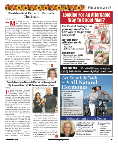 Bio-Identical Estradiol ProtectsLooking For An Affordable Way To Direct Mail?The Cost of Postage has gone up! We offer the best way to target your back yard!Our “Good News”publications goes to:• Helotes• Stone Oak• Bulverde & Spring BranchWhat you get!• Advertising to over 48,000 homes and businesses.• A customize ad at no additional cost.• Packages available with your business feature article & video!We Got You... Call NOW to get your space!(210) 548-6448www.highlightspub.comBy Dr. Donna BeckerThe Brain“ M y doctor told me I was too young for menopause! Told me to take an antidepressant for the moodiness and tiredness. But--I’m not really depressed!” One of the risk factors for Alzheimer’s Disease is untreated depression. But are you lacking some pharmaceutical drug, or could replacement of the hormones you had for the past 30+ years solve the moodproblem?“I can’t remember a thing! My doctorsaidIwasjustgettingolder”.Mildcognitive impairment may be a warning sign of Alzheimer’s. I heard a researcher state that in 20 years, more people will have Alzheimer’s than there are available people to care for them. We must do all we can NOW to protect our brains. Estradiol does protect the brain!For the first time in history, great numbers of women may live to see their 90th and beyond birthdays. The good news is that research has shown that estradiol does provide neuroprotection. Women who have late menopause and women who take hormones fare better in memory tests. After menopause however, the brain protective benefits are dependent on the type of hormone replacement. No surprise here, but the synthetic, horse derived estrogen did not help prevent Alzheimer’s, but only the 17-Beta estradiol type, which is the technical name for human estradiol.The human type (bio-identical) estradiol may be made in a laboratory, but the molecule is exactly like the one you made inside of yourself at age 18. Sort of like human-type of insulin—it is exactly like the one naturally occurring but is made in a lab.Bio-identical estradiol can be made by a compounding pharmacist into an easily applied cream, pellet, vaginal insert, tablet or by a pharmaceutical company in the form of a patch or tablet. Read more about it: “17-Beta Estradiol Improves Postmenopausal Memory Performance.” By D. Brauser 9/19/11 Medscape. PSYCHONEUROENDOCRINOLOGY Vol.30. issue 6 7/10 p558-567.Yes, there are side effects of hormone replacement therapy, and it is a lifestyle choice. A full and frank discussion of the side effects and risks of hormone therapy should be done prior to any prescription. Yes, it is natural for hormone production to stop, but it is also natural to dwindle and die. Our brains should last as long as our bodies.Call for free 15 min consult.Dr Donna BeckerSpecializes in anti-aging & health maintenance medicine.(210) 545-5224 www.antiagingsa.comGet Your Life Back with All NaturalHormonesFocus of Treatment:• Weight Loss• Hot Flashes• Vaginal Dryness• Insomnia• Loss of Libido• Thyroid Issues• Erectile Dysfunction• Weakness• Brain Fog• Vitamin Deficiencies• Bone Loss• Men & Women Anti-AgingEnhancement of Life CenterCall to schedule yourFREE consultation!(210) 545-522414603 Huebner Rd., Ste. 2601 (Huebner & NW Military)Dr. Donna BeckerTreatment Plan Includes:• 3 pages of Blood Work• Detailed Analysis• Individualized Treatments.Zenith Freedom Financial Services Recognized By Alamo Ranch/151 Business AssociationEBy Staffmember of the Alamo Ranch 151 Business Association. Edward is a charter member and states, “I am happy with the business connections and friendships I’ve made with AR151BA. Gina and Ronnie Barbera have provided a good service to the business community.”For many individuals, the risk of a significant catastrophic financial loss, when experienced, would cost them significantly more money and time, and could ruin their financial future.But an insurance policy with a quality insurance company that has earned high ratings with agencies such as A.M. Best, S&P, Fitch, and Moody’s-can take that risk, and with your premium contributions, share and reduce the burden of the catastrophic financial loss. This gives policy holders a great deal of financial protection, growth, and peace of mind benefits.Edward Quisenberry is a Texas licensed insurance agent celebrating fourteen years in the industry. He is appointeddward Quisenberry of Zenith Freedom Financial Services is celebrating another year asDirector , Gina Barbera with AR151BA presents plaque to Edward Quisenberry of Zenith Freedom Financial Services.with numerous highly rated insurance companies to provide personal, professional insurance benefits to his clients. Health insurance for all ages, life insurance, income protection disability insurance, solutions to long-term care, and common retirementconcerns.Contact Edward for a free quote byvisiting ZenithFreedom.com or call him at (210)-383-3687. He is dedicated to “Helping People Up!”November 2024www.heloteshighlights.com 9