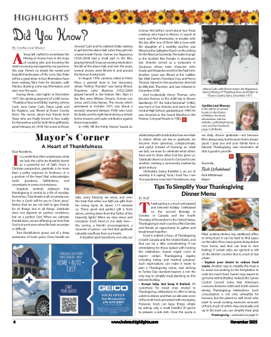 Did You Know?showed Cash and his sidekick Eddie waiting to get into the dance hall. Later, they get into a brawl inside Floore. Owner Joe Algueseva (1920-2004) had a small part in the film, playing himself. It was an exciting interlude in the life of the dance hall, and over the years, several movies were filmed in and around the famous honky-tonk.In August 1976, cameras rolled at Pete’s Place, a general store in San Geronimo, where “Rolling Thunder” was being filmed. Proprietor Latto Martinez (1922-2004) played himself in the feature film. Stars in the film were William Devane, Tommy Lee Jones, and Linda Haynes. The movie, which premiered in October 1977, was about a recently returned Vietnam POW who loses his family and his right hand during a violent home invasion and seeks retribution against those responsible.In 1999, “All the Pretty Horses,” based onCormac McCarthy’s novel about two Texas cowboys who head to Mexico in search of work and find themselves in trouble with the law after one of them falls in love with the daughter of a wealthy rancher, was filmed at the Gallagher Ranch as the setting for the Mexican hacienda. The ladies’ lounge in the Scottish Rite Temple in downtown San Antonio served as a restaurant in Zacatecas where main character John Grady and Alejandra meet for the final time. Another scene was filmed at the Cadillac Bar. Matt Damon, Penelope Cruz, and Henry Thomas starred in the production directed by Billy Bob Thornton, and was released in December 2000.And incidentally Henry Thomas, who became famous as the child star in Steven Spielberg’s “ET the Extra-Terrestrial” (1982), was born in San Antonio and went to East Central High School, graduating in 1990. He was honored as the Grand Marshal in the Helotes Cornyval Parade in 1983.relationship with God but also how we relate to others. When we live in gratitude, we become more generous, compassionate, and joyful. Instead of focusing on what we lack, we learn to celebrate what others have and to share what God has given us. Gratitude draws us closer to God and to one another, creating a community marked by grace and joy.Ultimately, being thankful is an act of worship. It is saying, “God, I trust You. I see Your goodness even here.”As believers, mayABy Cynthia Leal MasseyTexas bill crafted to incentivize the filming of movies here in the hope of creating jobs and boosting thestate’s economy was signed by our governor this year. There’s no doubt the varied and beautiful landscapes of the Lone Star State will be a great draw. In fact, filmmakers have been making films here for decades, with Helotes drawing some top filmmakers and stars over the years.During three, cold nights in December 1977, the opening segment of a CBS movie, “Thaddeus Rose and Eddie,” starring Johnny Cash, June Carter Cash, Diane Ladd, and Bo Hopkins, was filmed at Floore County Store. The movie, about two friends from Texas who are finally forced to face reality for themselves and for both their girlfriends, aired February 24, 1978. The scene at FlooreJohnny Cash, with Floore owner Joe Algueseva, during filming of “Thaddeus Rose and Eddie” at Floore Country Store, December 1977.Cynthia Leal Masseyis the author of several books on the historyof Helotes. For more information, visit her website, cynthialealmassey. com, and her Facebook page, CLM Books.we daily choose gratitude—not because life is always easy, but because God is always good. I pray you and your family have a blessed Thanksgiving and remember all that is good in your life.Sincerely,Rich WhiteheadRich Whitehead MayorMayor’s CornerA Heart of ThankfulnessDIear Residents,n a world that often emphasizes what we lack, the call to be thankful stands as a powerful act of faith. From aChristian perspective, gratitude is far more than a polite response to kindness—it is a posture of the heart that acknowledges God’s goodness, faithfulness, and sovereignty in every circumstance.Scripture reminds believers that thanksgiving is central to a life of worship. Paul writes,“Give thanks in all circumstances; for this is God’s will for you in Christ Jesus.” Notice that we are not told to give thanks for all things, but in all things. Gratitude does not depend on perfect conditions, but on a perfect God. When we cultivate thankfulness, we are affirming our trust that God is at work even when life feels uncertain or difficult.True thankfulness grows out of a deep awareness of God’s grace. Every breath wetake, every blessing we enjoy, and even the trials that refine our faith are gifts from His loving hand. As James 1:17 reminds us, “Every good and perfect gift is from above, coming down from the Father of the heavenly lights.” When we slow down and recognize God’s hand in our daily lives— the sunrise, a friend’s encouragement, a moment of peace—we find that gratitude naturally overflows from our hearts.A thankful spirit transforms not only ourBy StaffTips To Simplify Your Thanksgiving Dinner MenuTOctober in Canada and the fourth Thursday of November in the United States, Thanksgiving in each country offers families and friends an opportunity to gather and break bread together.Food is indeed a focus of Thanksgiving in both Canada and the United States, and that can be a little overwhelming if not intimidating for those tasked with hosting the celebration. Guests might come to expect certain Thanksgiving staples, including turkey and mashed potatoes. Such expectations can make it easier to plan a Thanksgiving menu, and sticking to Turkey Day standard bearers is not the only way to simplify meal planning on this beloved holiday.• Accept help, but keep it limited. It’s customary for loved ones invited to Thanksgiving celebrations to offer to bring a dish to dinner, and that can alleviate some of the work hosts are tasked with managing. However, hosts can keep things simple by asking only a small handful of guests to prepare a side dish. Once 