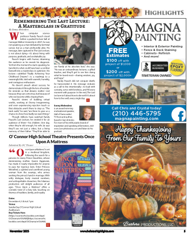 Remembering The Last Lecture: A Masterclass in GratitudeWBy Sonny Melendrezhen computer science professor Randy Pausch stood before a packed lecture hall atCarnegie Mellon University in 2007, he was not speaking as a man defeated by terminal cancer, but as a man profoundly alive. His message, later captured in The Last Lecture, is not about dying—it’s about living with purpose, gratitude, and unshakable joy.Pausch begins with humor, disarming the audience as he reveals his diagnosis. Yet from the moment he starts speaking, he transforms what could have been a somber farewell into a masterclass in optimism. His lecture—subtitled “Really Achieving Your Childhood Dreams”—is a roadmap to a meaningful life, told with warmth, humility, and contagious enthusiasm.He doesn’t preach about success; he demonstrates it through the lens of wonder. He reminds us that dreams matter—not because they can come true, but because of who we become while chasing them.Pausch’s stories of building virtual worlds, working at Disney Imagineering, and even experiencing rejection teach us that obstacles aren’t there to stop us. “The brick walls,” he said, “are there to give us a chance to show how badly we want things.”Though millions have watched Randy Pausch’s Last Lecture, he created it for an audience of three—his children. One day, when they’re old enough, his wife Jai says they’ll see not just a video, but a living memory of their father. “They’ll be able toFREE Estimates$100 off with project of $1,000 or$200 off with project of $2,000+• Interior & Exterior Painting • Fence & Deck Staining• Cabinets- Refinish• And more!VETERAN OWNEDCall Chris and Crystal today!(210) 446-5795magnapainting.comsee Randy at his absolute best,” she says. “He was an extraordinary lecturer, a gifted teacher, and they’ll get to see him doing what he loved most—sharing wisdom, joy, and hope.”Randy Pausch did not conquer death; he transcended it. His message endures as a call to live intentionally—to lead with curiosity, serve with kindness, and fill every moment with purpose. In the end, The Last Lecture isn’t about how to die well. It’s about how to live well, every single day.Sonny Melendrezis an award-winningmotivational speaker,Hall of Fame radio/TV host and author,based in San Antonio.For more of his enthusiastic brand of inspiration and speaking information, visit www.SonnyMelendrez.com and listen to his podcast.Happy Thanksgiving Happy ThanksgivingFrom Our Family To Yours From Our Family To YoursBarbera PRODUCTIONS, LLCO’ Connor High School Theatre Presents OnceSubmitted By OC TheaterUpon A Mattress“Once Upon a Mattress”is set in a medieval kingdom, following the search for a princess to marry Prince Dauntless, whose domineering mother, Queen Aggravain, has made it nearly impossible for anyone to pass her rigorous tests. Enter Princess Winnifred, a spirited and unrefined young woman from the swamps, who arrives seeking the prince’s hand in marriage. With witty dialogue, lively musical numbers, and unforgettable characters, this hilarious production will delight audiences of all ages. “Once Upon a Mattress” offers a comedic twist of a fairy tale, touching onthemes of tradition, family, and royalty.DatesDecember4,5&6at7pmVenueSandra Day O’Connor High School AuditoriumBuy Tickets Here [https://oconnorhs.booktix.com/dept/ OCDrama/e/OUAM](https://oconnorhs. booktix.com/dept/OCDrama/e/OUAM)November 2025www.heloteshighlights.com 5Now OfferingEPOXYFlooring!