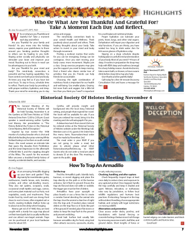 WBy Ann Newstead PT, DPT, PhDho or what are you Thankful andGrateful for? Take a momenteach day and reflect.Are you Thankful for your family andfriends? As you move into the holiday season, express your gratefulness to those around you. Sending positive thoughts to others can be healing to you both. Staying active socially and physically can stimulate your brain and improve your mood. Reaching out to those in need can be advantageous to you both.Are you Thankful for your mind and body? The mind-body connection is powerful and has healing capabilities. You have control over both your mind and body. At times you may feel as if you have lost your focus. To stay in focus, schedule time to reflect. Thank your body by providing it with proper nutrition, hydration, and sleep. Thank your mind for reminding you to stayTake A Moment Each Day And Reflect.Who Or What Are You Thankful And Grateful For?active and engage.The mind-body connection leads toyour overall Health and Wellness. Think positively about yourself and others. Think healing thoughts about your body. Take action to invest in your mind and body through movement.Finding a workout routine that works for you can be energizing. Energy can be contagious. Once you start moving, your body craves more movement. Maybe join a class. Group exercise programs may give you the support you need to keep moving. Find a friend who shares similar love of activities that you do. Friends can help friends be accountable.Choosing the right combination of nutritious foods is important for our health and well-being. Use smaller plates. Grazing. Eat more fruits and veggies. Eat a little bit less than you think you “need” is importantfor a well-balanced nutritional intake. Proper hydration can lubricate your joints, heart, lungs, and other vital organs. Dehydration will impair your digestion and vital functions. If you are thirsty, you have waited too long to drink water. Aim for8-8-ounce glasses of hydration a day. Staying on a sleep schedule despite holiday plans is useful for rest and restoration of your body. Most of you need 7-9 hours of sleep. A routine in preparation for sleep may help with REM sleep and readiness (energy) for a busy holiday season. Avoid electronics, take a warm bath, or shower, or have a warmdrink before sleep time may also help.Give thanks and be grateful daily!Call today for a free 30-minute DiscoveryConsultation Visit and leave a message for Ann:Ann H. Newstead, PT, DPT, PhDExercise Expert in Aging Adults Vestibular (Dizziness) Specialist, Geriatric and Neurologic Specialist14418 Old Bandera Rd. Helotes, TX 78023 210-833-8336 Ahnewphysicaltherapy.comTSubmitted By HSHhe General Meeting of the Historical Society of Helotes will be held Tuesday, November 4, atthe Gardens at Old Town Helotes at 15060 Antonio Drive from 12:00 to 2:00 pm. Guest speaker is award-winning author Cynthia Leal Massey. Her presentation is: “The History Behind the Fiction in the Historical Crime Mystery, Well of Deception.”Inspired by true events—the 1958 murder of a turkey breeder who is shot and killed while feeding her prize-winning White Holland turkeys on her farm in south central Texas—the novel weaves an intricate tale that spans the decades from Prohibition and the Great Depression to the aftermath of World War II, and the crippling drought of the fifties. The search for the woman’s killer uncovers a troubled family history of insanity, accidental deaths, and suicides.BGy Lou Dugganot an annoying Armadillo diggingup your lawn and garden? Theydig mainly for invertebrates: grubs, earthworms, beetle larvae, ants, termites, crickets, and other soil-dwelling insects. They also eat spiders, scorpions, snails, occasional small reptiles and eggs, carrion, and some plant material such as fruits, root vegetables, seeds, and mushrooms. They locate food by smell and use strong front claws to root in loose, often irrigated soil or mulch, creating multiple shallow holes up to about six inches deep when foraging.Wanna get rid of it? Well, they are best caught with a sturdy live cage trap placed on their travel path; bait is usually ineffective and can attract non-target animals. Traps can be purchased at your local hardware store for about $35.Cynthia will provide insight and background into the local story, historical setting, and people that inspired her novel. Her book will be available for sale. If you have pre-ordered her novel, bring it to the meeting and she will autograph it for you.A deluxe box lunch from Jason’s Deli can be ordered online at the Historical Society of Helotes website under the Meetings tab. Member cost is $15, guests $18. Order from five menu items. Reservation/meal order must be made by November 2nd.The meal order is your RSVP. If you are not going to order a meal, but plan to attend, please email info@ historicalsocietyofhelotes.org to RSVP. Guests who do not order a meal are asked to donate $5 at the door. This meeting is open to the public.Historical Society Of Helotes Meeting November 4How To Trap An ArmadilloSet the trapFind the Armadillo’s path. Identify trails, burrows, or recent digging and place the trap directly on the path or at the burrow entrance. Set it flush to ground. Ensure the trap sits flat and does not rattle or wobble; the trigger pan must be free of debris.Armadillos have poor eyesight so place boards or use a fence line to create a corridor funnel directing the animal into the trap. Give the animal a clear line of sight into the trap and, if needed, place natural debris on the trap floor so it looks like part of the ground. If needed, place flat stones or stakes to keep the trap flush to the ground and prevent wobbling.Avoid bait. Surface bait usually fails because armadillos dig for food; using bait often attracts raccoons, opossums, skunks,or cats, reducing success.Checking, handling, and after captureCheck frequently: Inspect traps at least once daily to reduce stress and exposure to any captured an