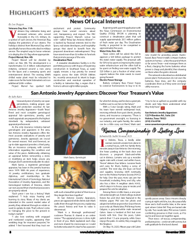 By Lou DugganVeterans Day, Nov. 11theterans Day celebrates living and deceased veterans who served honorably in the U.S. military. As a symbol of such service, the American flag displays the patriotism of our citizens. The holiday is distinct from Memorial Day, which specifically honors those who died in military service. The simplest way to honor veterans is to display the U.S. flag where appropriate. Project Marvel, Nov. 4thProject Marvel will be decided by voters on Nov. 4th. The development is a transformative $3–4 billion redevelopment initiative, centered around a new arena for the Spurs and a sweeping sports and entertainment district. The existing SAWS chilled water plant must be relocated to make room for the hotel. Estimated cost is an additional $200+ million.Project Marvel has sparked bothNews Of Local Interestexcitement and protest. Community groups have voiced concerns about cost, transparency, and impact. The PAC supporting Project Marvel’s venue tax vote—called “Keep San Antonio Vibrant”— is backed by financial interests tied to the Spurs, real estate developers, and hospitality groups that stand to benefit from the proposed downtown redevelopment. They have raised more than $2 million to fund ads that promote passage of the vote. Desalination PlantA seawater desalination facility is in the permitting process with hopes of beginning construction in Southeast Texas, as water supply remains a top priority for several regions across the state. EPCOR Utilities Inc. recently announced its intent to begin construction and eventual operation of a facility in Galveston Bay, a region that is home to almost eight million people.Beginning with a permit application with the Texas Commission on Environmental Quality (TCEQ), EPCOR is planning to construct a desalination plant that will supply approximately 26.5 million gallons of fresh water per day. The Desalination Facility is projected to be completed in approximately five years.Water Vote, Nov. 4thTexas voters will be asked this fall to approve a $20 billion package to protect the state’s water supply. The proposal calls for 50% to be spent on improving the state’s water infrastructure and the other half to be spent on finding new water supply. The $20 billion is just a fraction of what some experts believe the state needs to invest going forward.Electric Power StorageBattery company Base Power hopes to convince homeowners to buy in to itsnew model for providing power. Austin- based, Base Power installs compact battery systems in homes—a few thousand of them so far across Texas—and manages them as a fleet, charging the home batteries when power is cheap and plentiful, then drawing on them when the grid is stressed.The network is described as a distributed power plant. Homeowners do not own the batteries, Base does, and the company coordinates them as if they were one large utility resource.BAy Sally Kalostreasured piece of jewelry can spanfor what he’s doing, and he does a great job. I will be sure to use him in the future.”With a 5-star Google rating, Mark and his team have earned widespread trust, receiving referrals from past clients, jewelry stores, and insurance companies. “There is no government oversight, no licensing in our industry, and quite frankly, the waters can be a little scary out there,” Mark said.n Helotes, Texas, a kindly older woman named Lorraine lives alone in a rental house, with her family thirty“I try to be as upfront as possible with my clients and help them understand what they truly have.”San Antonio Jewelry Appraisers12274 Bandera Rd., Suite 236Helotes, Texas 78023(210) 316-8758 www.sanantoniojewelryappraisers.comSan Antonio Jewelry Appraisers: Discover Your Treasure’s Valuegenerations, making proper careand protection essential. At San Antonio Jewelry Appraisers—South Texas’ finest and most complete gemological appraisal lab—gemstone, jewelry, and watch appraisals are prepared to the highest standards by independent, unbiased appraisal professionals.As the only insurance industry–trained gemologists and appraisers in the area, San Antonio Jewelry Appraisers offers the most accurate evaluations of jewelry and gemstones. Jewelry appraisals are crucial for several reasons. First and foremost, an up-to-date appraisal provides a third party, like an insurance company, with current information regarding the condition and value of the piece. Additionally, obtaining an appraisal before remounting a stone or modifying an item helps ensure any changes don’t unintentionally alter its value.Mark Saenz, a registered gemologist appraiser, has been in the jewelry business since 1979. With 46 years of experience, 10 jewelry certifications, two graduate diplomas, and memberships in the International School of Gemology, National Association of Jewelry Appraisers, and the Gemological Institute of America, clients can rest assured their cherished possessions are properly valued.“Each piece I see has a history,” Mark explained. “I truly enjoy hearing and learning its story. Many of my clients are interested in the current market value of jewelry they obtained through an estate or want to update its style. That’s where I come in—bringing the piece to the present in today’s market.”“I also love working with engaged and newlywed couples, appraising their wedding rings for insurance purposes,” he added. “I feel honored that they trust meIRescue, Companionship & Lasting Love Submitted By Judith Newman, M.D.Mark Saenz, Gemologistwith such a beautiful symbol of their love as they begin their lives together.”At San Antonio Jewelry Appraisers, pieces are appraised while clients wait. Mark walks them through the process, explaining the piece’s history and how its value is determined.“Mark is a thorough professional,” customer Thomas B. shared in an online review. “The appraisal process is done right in front of you. Mark explained each step and even shared his