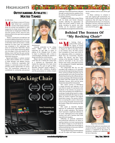 Outstanding Athlete : Mateo Tamezchallenges. These traits have been cultivated through consistent practice, guidance from his coaches, and the unwavering support of his family and friends.In addition to golf, Mateo enjoys fishing with his family and friends whenever possible, reflecting his appreciation for nature and leisure outside of sports. His family, including his parents and older brother, are his staunchest supporters, providing the encouragement and love thatfuel his ambitions both on and off the golf course.As Mateo continues to compete in local and regional golf tournaments, he looks forward to further achievements and experiences that will shape his future in golf and beyond. His story is one of passion, dedication, and the continuous pursuit of excellence, inspired by familial influences and a love for the game.MBy Sally Kalosateo Tamez, a junior at O’Connor High School and a prominent member of the Varsity Golf team,shares his journey and aspirations in golf, inspired by his Great Uncle Henry Salinas. Golf has been an integral part of Mateo’s life since the summer of 2021, when his uncle introduced him to the sport and recognized his potential.Mateo’s commitment and skill have led to several notable achievements. He is set to be inducted into the National Honor Society in November 2024 and has been a varsity letterman for three years. His dedication was recognized in his sophomore year when he received the “Work Ethic” Award from his coaches. Most impressively, Mateo won the player of the year award for the Beltway Junior Golf Tour this past summer and serves as the Golf Team Captain for the 2024-2025 school year.Beyond golf, Mateo is actively involved in other school activities. He is a member of SASO (Scholars and Athletes Serving Others), a mother-son organization that engages in community service and offers personal growth opportunities for young men. This involvement underscores his commitment to community and personalBehind The Scenes Of “My Rocking Chair”development.Currently undecided on his collegechoice, Mateo aims to continue improving his golf skills in hopes of playing at the collegiate level. He plans to major in architecture with a minor in communications, blending his interests in design and effective communication.Mateo’s favorite memory from his golf career thus far is making the varsity team as a freshman—an achievement that marked the beginning of his high school golf journey. The sport of golf, as Mateo describes, demands mental resilience, a strong work ethic, confidence, discipline, and the perseverance to continue despiteBy Sally Kalos“ M y R o c k i n g C h a i r ,” a profound film exploring the impact of mental illness on a young man’s life, first premiered on August 23, 2024, at City Base Cinema in San Antonio, Texas. The film’s journey from conception to screen owes much to the collaborative efforts of a talented trio: Mayte Ruiz, the Screenwriter; Alejandro Aldana, the Director; and Bert Lopez, serving as the Executive Producer. They aimed to shed light on the root causes behind crime stories, particularly focusing on the protagonist’s troubled upbringingand mental challenges.This independent film has not onlyresonated with audiences at its premiere but now also through streaming on Amazon Prime, earning accolades along the way. It’s garnered awards such as the Cine Paris Film Festival Award and was the official selection at various prestigious film festivals including the Berlin Indie Film Festival 2025, Lift-Off Filmmaker Sessions 2024, and the Santa Clarita International Film Festival 2024.Bert Lopez’s journey in filmmaking is deeply personal and reflective of his roots. Born in Laredo, TX, and raised on the Southside of San Antonio, his passion for acting and storytelling was kindled from a young age. Despite being raised in a single- parent household after the tragic loss of his father, his mother’s resilience and support fueled Bert’s dreams. This passion led Bert from re-enacting film scenes in their living room to acting alongside renowned actors like Damian Chapa and venturing into film production.Bert Lopez as Executive Producer balanced his professional responsibilities with his creative aspirations. “My Rocking Chair” represents a significant milestone in his career, challenging him to find suitable locations and craft a narrative that’s both respectful and engaging.Reflecting on personal experiences and professional milestones, his advice to aspiring creatives is to never cease pursuing your dreams. Engage in as much hands-on experience as possible, from church plays to professional training, to hone your craft and make your mark in the arts.Through“My Rocking Chair,”the talented trio aim to inspire and impact audiences,Alejandro Aldana, Director.Bert Lopez, Executive Producer.Mayte Ruiz, Screenwriter.drawing on the profound connections and narratives that film uniquely delivers. Their journey is a testament to the power of persistence, creativity, and collaboration in the face of adversity.10www.heloteshighlights.comDec. / Jan. 2024-25
