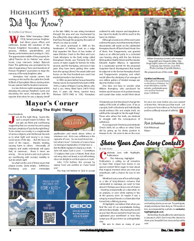 Did You Know?in the late 1880s, he was riding horseback through the area and was mesmerized by the rolling hills, deep valleys and the “stream that flows through the property, the water of which is as clear as crystal...”His ranch, purchased in 1898 on the headwaters of Helotes Creek on a ridge that separates the flows of two bodies of water (Helotes Creek to the West and Leon Creek tributaries to the East), today called Krempkau’s Divide, was “formerly the chief source of water supply for farmers for miles around, said Mr. Krempkau, and even in late years they have been getting their water from the springs [there].” He raised cattle and horses on the four-hundred-acre ranch but resided primarily in San Antonio.In 1892, six years before he purchased his Helotes ranch, he married Emma Sams (1858- 1941), a native of Wayne County, Illinois, who had a son, Henry Ward Sams (1875-1932), then 17 years old. Henry married Anna Monken (1879-1946) in 1902. Krempkauoutlived his wife, stepson and daughter-in- law. Upon his death, he left his ranch to the Sams’ six children.Although several acres of the ranch were soldovertheyears,morethantwentyofSams descendants still reside on the subdivided Krempkau Ranch off Sam’s Ranch Road. One of them, Ann Toepperwein, was granted status as an affected party in a contested case hearing, along with the San Antonio Metropolitan Health District and the Greater Edwards Aquifer Alliance, in opposition to a wastewater permit for the proposed Guajolote Ranch development that would be adjacent to the former Krempkau Ranch and Toepperwein’s property, and which would allow the dumping of an average of one million gallons of treated sewage per day into Helotes Creek.One does not have to wonder what William Krempkau, who purchased his Helotes ranch because of its pristine beauty and crystal-clear water, would think aboutChristianity yet, but that doesn’t change the reality of His truth of selfless Love. If we as a people, both collectively and individually, would embrace this one simple truth, we will find the strength to “do the right thing”. Those who refuse this truth, are destined to struggle with the consequences of selfishness.As we approach Christmas and celebrate Christ’s birth, let us reflect on what Christ did by giving up his divine position in Heavan to do. He came to die on the crossWBy Cynthia Leal Masseyilliam “Billie” Krempkau (1863- 1953), famed pioneer freighter, trail driver, peace officer, andcattleman, hosted 200 members of the Pioneer Freighters’ Association, including spouses, children, grandchildren, and friends, on his Helotes ranch on May 21, 1922. The approximate middle of the property he called “Rancho de los Helotes” was where Scenic Loop intersects today’s Babcock Road. The gathering was prompted by his idea of organizing a “Sons and Grandsons of Pioneer Freighters” association to keep the memory of the early freighters alive.Krempkau had myriad careers, but working on the trail for the cattle firm Smith & Elliott of Springfield, Illinois starting when he was sixteen held his fondest memories.In a San Antonio Light newspaper article detailing the pioneer freighters’ event and describing the ranch, Krempkau told the reporter that when he was a deputy sheriffWilliam Krempkau (center) with Howard Varga (left) and Howard’s father, Alex Varga (right), owner of Lone Star Saddlery Company, San Antonio, circa 1900.Photo courtesy of Lynette Munson.this proposed use of the creek.Cynthia Leal Masseyis the author of several books on the history of Helotes. For more information, visit her website, cynthialealmassey. com, and her Facebook page, CLM Books.for your sins even before you ever existed or knew Him. He loves you that much. Let us choose to ‘love others as He has loved us’ and live selflessly instead of selfishly.Sincerely,Rich WhiteheadRich Whitehead MayorMayor’s CornerDoing The Right ThingJDea.r Residents,ust do the right thing. Seems like such a simple maxim to follow. Yet our jails are filled and overflowing suggesting that our society has yet to grasp the basic simplicity of“just do the right thing”. To be certain our society is a conglomerate of various religions and intellectual discords as to what ‘right’ and ‘wrong’ is on many social issues of the day.... But lets focus on some of the majors.... Murder, stealing, causing harm to others. Universally, all religions and stable individuals will agree that, at minimum, those 3 items are wrong.... Yet our prisons and court systems are overflowing with society’s inability to ‘just do what’s right’.So what’s at the core of these issues that plague society. Quite simply... Selfishness. Prioritizing your own immediategratification and needs above others at whatever cost. At its core, selfishness is the opposite of Love. So, we need more love... but what is love? Centuries of science have no biological explanation of what love is.... But the Bible explains it clearly as a truth. 1 John 4:8 states ‘God is Love’. 1 Corinthians 13 explains that Love is Patient, Kind, does not envy, does not boast, is not self-seeking, does not delight in evil but rejoices in truth.John 13:34 furthers this concept by saying “Love one another as I have loved you”You may not believe in God or acceptShare Your Love Story Contest!enchanting stories as we can. To participate, simply email your love story, in 150 words or less, accompanied by a photo, to contest@ highlightspub.com.Remember, the deadline for submissions is January 9, 2025. Don’t miss this chance to share your beautiful love story and possibly win!By Sally KalosCelebrate Love with Highlights Publications .This February, Highlights Publications is calling on all romantics to share their unique love stories in our special contest! We’re eager to hear about that magical moment when you met your sweetheart, with a chance for you to win$50.Whether it was a case of love at first sight,