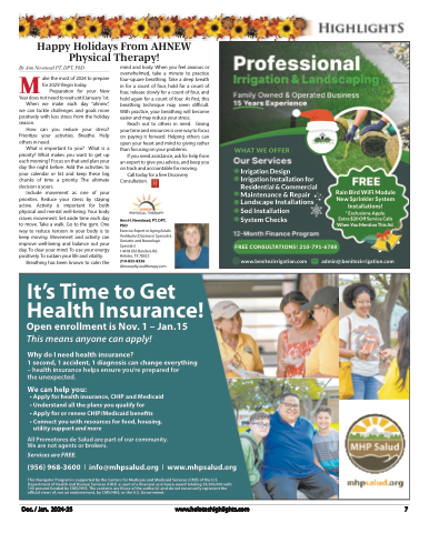 Happy Holidays From AHNEW Physical Therapy!mind and body. When you feel anxious or overwhelmed, take a minute to practice four-square breathing. Take a deep breath in for a count of four, hold for a count of four, release slowly for a count of four, and hold again for a count of four. At first, this breathing technique may seem difficult. With practice, your breathing will become easier and may reduce your stress.Reach out to others in need. Giving your time and resources is one way to focus on paying it forward. Helping others can open your heart and mind to giving rather than focusing on your problems.If you need assistance, ask for help from an expert to give you advice, and keep you on track and accountable for moving.Call today for a free Discovery Consultation.Ann H. Newstead, PT, DPT, PhDExercise Expert in Aging Adults Vestibular (Dizziness) Specialist, Geriatric and Neurologic Specialist14418 Old Bandera Rd. Helotes, TX 78023 210-833-8336 Ahnewphysicaltherapy.comWHAT WE OFFERIrrigation Design Irrigation Installation for Residential & Commercial Maintenance & Repair Landscape InstallationsSod Installation System ChecksRain Bird WiFi Module New Sprinkler System Installations!* Exclusions Apply. Extra $20 Off Service Calls When You Mention This Ad.FREE CONSULTATIONS! 210-791-6788 www.benitezirrigation.com admin@.benitezirrigation.comBMy A n n N e w s t e a d P T , D P T , P h Dake the most of 2024 to prepare for 2025! Begin today.Preparation for your New Year does not need to wait until January 1st. When we make each day “ahnew”, we can tackle challenges and goals more positively with less stress from the holidayseason.How can you reduce your stress?Prioritize your activities. Breathe. Help others in need.What is important to you? What is a priority? What makes you want to get up each morning? Focus on that and plan your day the night before. Add the activities to your calendar or list and keep these big chunks of time a priority. The ultimate decision is yours.Include movement as one of your priorities. Reduce your stress by staying active. Activity is important for both physical and mental well-being. Your body craves movement. Set aside time each day to move. Take a walk. Go to the gym. One way to reduce tension in your body is to keep moving. Movement and activity can improve well-being and balance out your day. To clear your mind. To use your energy positively. To sustain your life and vitality.Breathing has been known to calm theIt’s Time to GetHealth Insurance! Open enrollment is Nov. 1 – Jan.15 This means anyone can apply!Why do I need health insurance?1 second, 1 accident, 1 diagnosis can change everything – health insurance helps ensure you’re prepared forthe unexpected.We can help you:• Apply for health insurance, CHIP and Medicaid• Understand all the plans you qualify for• Apply for or renew CHIP/Medicaid benefits• Connect you with resources for food, housing, utility support and moreAll Promotores de Salud are part of our community. We are not agents or brokers.Services are FREE.(956) 968-3600 I info@mhpsalud.org I www.mhpsalud.orgThis Navigator Program is supported by the Centers for Medicare and Medicaid Services (CMS) of the U.S. Department of Health and Human Services (HHS) as part of a financial assistance award totaling $4,500,000 with 100 percent funded by CMS/HHS. The contents are those of the author(s) and do not necessarily represent the official views of, nor an endorsement, by CMS/HHS, or the U.S. Government.Dec. / Jan. 2024-25www.heloteshighlights.com 7