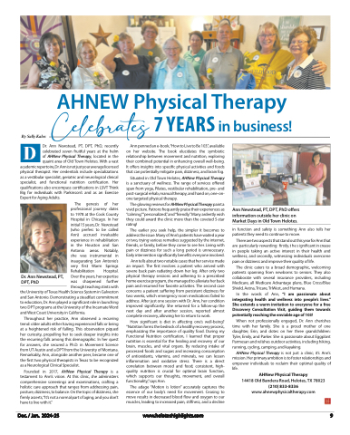 By Sally KalosCelebrates7 YEARS in business!AHNEW Physical TherapyD Dr. Ann Newstead, PT, DPT, PhD, recently celebrated seven fruitful years at the helm of AHNew Physical Therapy, located in the quaint area of Old Town Helotes. With a vast academic repertoire, Dr. Ann is not just your average licensed physical therapist. Her credentials include specializations as a vestibular specialist, geriatric and neurological clinical specialist, and functional nutrition certification. Her qualifications also encompass certifications in LSVT Think Big for individuals with Parkinson’s and as an ExerciseAnn penned an e-book,“How to Live to Be 103”, available on her website. The book elucidates the symbiotic relationship between movement and nutrition, exploring their combined potential in enhancing overall well-being. It offers insights into specific physical activities and foods that can potentially mitigate pain, dizziness, and brain fog.Situated in Old Town Helotes, AHNew Physical Therapy is a sanctuary of wellness. The range of services offered span from yoga, Pilates, vestibular rehabilitation, pre- and post-surgical rehab, manual therapy, and hand on, one-on- one targeted physical therapy.The glowing reviews for AHNew Physical Therapy paint a vivid picture. Patrons frequently praise their experiences as “calming,”“personalized,” and “friendly.” Many ardently wish they could award the clinic more than the coveted 5-star rating!The earlier you seek help, the simpler it becomes to address the issue. Many of Ann’s patients have waited a year or two, trying various remedies suggested by the internet, friends, or family, before they come to see her. Living with pain or dizziness for such a long period is unnecessary. Early intervention significantly benefits everyone involved.Ann tells about two notable cases that her service made an impact. The first involves a patient who arrived with severe back pain radiating down her leg. After only two physical therapy sessions and adhering to a prescribed home exercise program, she managed to alleviate her back pain and resumed her favorite activities. The second case concerns a patient suffering from persistent dizziness for two weeks, which emergency room medications failed to address. After just one session with Dr. Ann, her condition improved significantly. She returned for a follow-up the next day and after another session, reported almost complete recovery, allowing her to return to work.How significant is diet in affecting one’s well-being? “Nutrition forms the bedrock of a healthy recovery process, emphasizing the importance of quality food. During my Functional Nutrition certification, I learned that proper nutrition is essential for the healing and recovery of our brain, muscles, and vital organs. By reducing intake of processed foods and sugars and increasing consumption of antioxidants, vitamins, and minerals, we can lessen inflammation and oxidative stress. There is a direct correlation between mood and food; consistent, high- quality nutrition is crucial for optimal brain function, which supports our thoughts, movement, and overall functionality,” says Ann.The adage “Motion is lotion” accurately captures the essence of our body’s need for movement. Ceasing to move results in decreased blood flow and oxygen to our muscles, leading to increased pain, stiffness, and a declineExpert for Aging Adults.Dr. Ann Newstead, PT, DPT, PhDThe genesis of her professional journey dates to 1978 at the Cook County Hospital in Chicago. In her initial 15 years, Dr. Newstead (who prefers to be called Ann) accrued invaluable experience in rehabilitation in the Houston and San Antonio areas. Notably, she was instrumental in inaugurating San Antonio’s very first Warm Springs Rehabilitation Hospital. Over the years, her expertise was sharpened further through teaching stints withAnn Newstead, PT, DPT, PhD offers information outside her clinic on Market Days in Old Town Helotes.in function and safety is something Ann also tells her patients they need to continue to move.There are two aspects that stand out this year for Ann that are particularly rewarding: firstly, t he s ignificant in crease in people taking an active interest in their health and wellness; and secondly, witnessing individuals overcome pain or dizziness and improve their quality of life.The clinic caters to a broad demographic, welcoming patients spanning from newborns to seniors. They also collaborate with several insurance providers, including Medicare, all Medicare Advantage plans, Blue Cross/Blue Shield, Aetna, Tricare, TriWest, and Humana.In the words of Ann, “I am passionate about integrating health and wellness into people’s lives.” She extends a warm invitation to everyone for a free Discovery Consultation Visit, guiding them towards potentially reaching the enviable age of 103!When not professionally engaged, Dr. Ann cherishes time with her family. She is a proud mother of one daughter, Erin, and dotes on her three grandchildren: Tyler, Emily, and Parker. She is passionate about Eggplant Parmesan and relishes outdoor activities, including hiking, running, cycling, camping, and kayaking.AHNew Physical Therapy is not just a clinic; it’s Ann’s mission. Her primary ambition is to foster relationships and empower individuals to reclaim their optimal quality of life.AHNew Physical Therapy14418 Old Bandera Road, Helotes, TX 78023(210) 833-8336www.ahnewphysicaltherapy.comthe University of Texas Health Science System in Galveston and San Antonio. Demonstrating a steadfast commitment to education, Dr. Ann played a significant role in launching two DPT programs at the University of the Incarnate Word and West Coast University in California.Throughout her practice, Ann observed a recurring trend: older adults either having experienced falls or being at a heightened risk of falling. This observation piqued her curiosity, propelling her to seek deeper insights into th