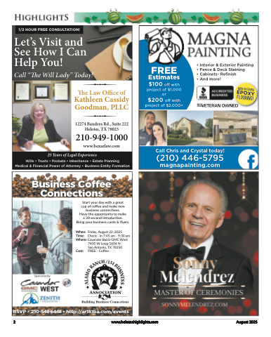 1/2 HOUR FREE CONSULTATION!Let’s Visit and See How I Can Help You!Call “The Will Lady” Today!The Law Office ofKathleen Cassidy Goodman, PLLC12274 Bandera Rd., Suite 222www.BexarLaw.comHelotes, TX 78023210-949-1000 www.bexarlaw.com25 Years of Legal ExperienceWills • Trusts • Probate • Inheritance • Estate Planning Medical & Financial Power of Attorney • Business Entity FormationFREE Estimates$100 off with project of $1,000 or$200 off with project of $2,000+• Interior & Exterior Painting • Fence & Deck Staining• Cabinets- Refinish• And more!VETERAN OWNEDCall Chris and Crystal today!(210) 446-5795magnapainting.comBusiness Coffee ConnectionsStart your day with a great cup of coffee and make new business connections.Have the opportunity to makea 30 second introduction. Bring your business cards & flyers.When: Friday,August22,2025Time: Check - in 7:45 am - 9:30 am Where: Cavender Buick-GMC West7400 W Loop 1604 N San Antonio, TX 78250Cost:Sponsored ByASSOCIATIONBuilding Business Connectionswww.ar151ba.comRSVP • 210-548-6448 • http://ar151ba.com/events2 www.heloteshighlights.com August 2025Now OfferingEPOXYFlooring!HCNA/151RBUSOINMEALASS