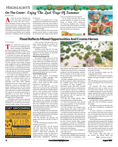 On The Cover: Enjoy The Last Days Of Summerand savor the little moments together.So, go ahead and plan that end-of- summer getaway to surprise your kids, family, or friends. These experiences can bring joy, laughter, and a stronger connection with your loved ones, ensuring that the memories from this summer willlast long into the new school year.y Sally KalosBAugust has arrived, signaling that a new school year is just around the corner. But don’t stress—there’s still plenty of time to enjoy one last summer hurrah! San Antonio, right in our own backyard, offers a wealth of water-filled adventures—from rivers and lakes to resort swimming pools and even the ocean, all just a short drive away. Whether you’re seeking adventure or relaxation, there’s somethingfor everyone.Summer is the perfect time to createlasting memories with family. As you gear up for the back-to-school rush, why not plan a special outing? It’s a wonderful opportunity to make those memories that everyone will look back on fondly.Consider exploring local natural parks, playing outdoor sports, or simply relaxing by the beach. Don’t forget to take photosBTy Lou Dugganhree weeks have gone by since the flood on the Guadalupe River. Now, in retrospect, more details ofthis historic tragedy are becoming clear. The catastrophic flooding on July 4, 2025, was triggered by an extreme weather setup: 1. A low-level jet stream and upper-level disturbance funneled moisture into the Hill Country. 2. Remnants of Tropical Storm Barry added instability and enhanced rainfall. 3. The Hill Country’s steep terrain funneled water rapidly into rivers, accelerating flash flood conditions. 4. Rainfall rates reached 4 inches per hour, overwhelming the terrain. 5. Up to 26 feet of river rise in just 45 minutes in Kerrville, with 20+ inches of rain reported in nearby areas like Streeter and Bertram.As of July 16, the following data was compiled from state and federal sources: At least 132 confirmed deaths across six counties; 161 people unaccounted for statewide; more than 2,000 residents evacuated from Kerr, Travis, Burnet, and Williamson counties; an estimated 5,000+ people displaced across the Hill Country region and includes those whose homes were destroyed or rendered uninhabitable. The volume of rain that poured down is estimated to be more than 100 billion gallons, a staggering amount that surpasses the daily flow over Niagara Falls.Camp Mystic, a girls’ summer camp, had approximately 750 campers at the time. Floodwater rose 26 feet in just 45 minutes, catching campers asleep; 27 lives were lost.6Some survivors said they woke up to water rushing through the windows. The Camp was devastated—many campers were trapped or missing.Peak River Levels: Hunt, TX: 37.52 feet, a new record; Kerrville, TX: 34.29 feet, third highest on record; Comfort, TX: 35.26 feet, well above major flood stage.Why This Flood Stands OutThe speed at which water rose, 26 feet in 45 minutes, overwhelmed camps and homes. More than 36 children died. Up to 20.33 inches of rain fell in hours—equivalent to four months of rain. No sirens, limited cell coverage, and delayed alerts worsened the toll. This flood is recognized as one of the deadliest natural disasters in modern Texas history and the fastest river rise on record. Flood Timeline by Hour--July 2, Texas Division of Emergency Management (TDEM) activated state resources in anticipation of flooding.--July 3, 1:18 PM, National Weather Service issued a flood watch for Kerr County, warning of 5–7 inches of rain.--July 4, 1:14 AM, NWS sent out its first “flash flood” warning for Kerr and Bandera counties to when the first flooding reports came in from low-lying water crossings. This gave local officials a 3-hour, 21-minute window to save lives in Kerr County. Executive Director Richard “Dick” Eastland received the “life-threatening flash flooding” alert. Despite the warning, evacuations didn’t begin until around 2:30 a.m. by which time the Guadalupe River and Cypress Creek were already surging. Eastland, 74, died while trying to evacuate a cabin which was overtaken by floodwaters.--3:26 AM., a firefighter warned a dispatcher that a road along the river was impassable, blocking off the city of Hunt from emergency responders coming from the east.--3:30 AM, Kerrville’s city manager was jogging near the river and saw no signs of flooding.--3:35 AM, NWS Warning upgraded: “Move to higher ground now”.--4:03 AM, two hours and 49 minutes after their initial flood warning, federal forecasters warned that the rain had created a flash flood emergency for south-central Kerr County. An alert sent to Bandera and Kerr counties stated “This is a PARTICULARLY DANGEROUS SITUATION.SEEK HIGHER GROUND NOW!” and “Move to higher ground now! This is an extremely dangerous and life-threatening situation. Do not attempt to travel unless you are fleeing an area subject to flooding or under an evacuation order.”--4:22 AM, a firefighter, about an hour into the flood response, asked a dispatcher if the CodeRED system could be activated for residents of Hunt. CodeRED is a web-based system that sends recorded messages and text alerts to residential and business phones, warning of a flood, fire, or any emergency where a fast notification could save lives. “Stand by, we have to get that approved with our supervisor,” the dispatcher responded.--4:35 AM, Kerr County Sheriff’s Office received first reports of flash flooding. --5:11 AM, First responders were carrying out rescue operations in the floodwaters, the CodeRED alert was not sent.--5:30 AM, Kerrville’s city manager woke Mayor Herring with a phone call and told him the downtown park was under water. --5:34 AM, Forecasters pushed out a second flash flood emergency alert, this time for east central Kerr County, saying that “a large and deadly flood wave” was headed down the Guadalupe River. About the same time the Kerr County Sheriff’s Office po