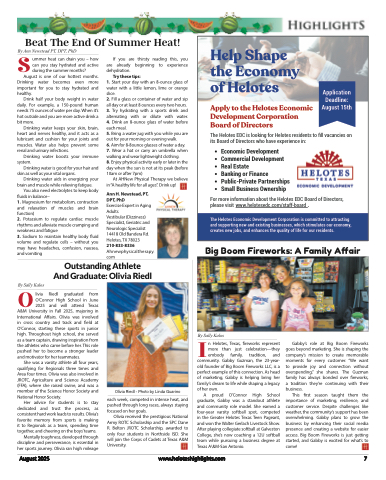 Application Deadline: August 15thThe Helotes EDC is looking for Helotes residents to fill vacancies on its Board of Directors who have experience in:Economic Development Commercial Development Real EstateBanking or Finance Public-Private Partnerships Small Business OwnershipFor more information about the Helotes EDC Board of Directors, please visit www.helotesedc.com/staff-board .The Helotes Economic Development Corporation is committed to attracting and supporting new and existing businesses, which stimulates our economy, creates new jobs, and enhances the quality of life for our residents.Beat The End Of Summer Heat!SBy Ann Newstead PT, DPT, PhDummer heat can drain you – how can you stay hydrated and active during the summer months?August is one of our hottest months. Drinking water becomes even more important for you to stay hydrated and healthy.Drink half your body weight in water daily. For example, a 150-pound human needs 75 ounces of water per day. When it’s hot outside and you are more active drink a bit more.Drinking water keeps your skin, brain, heart and nerves healthy, and it acts as a lubricant and cushion for your joints and muscles. Water also helps prevent some renal and urinary infections.Drinking water boosts your immune system.Drinking water is good for your hair and skin as well as your vital organs.Drinking water aids in energizing your brain and muscle while relieving fatigue.You also need electrolytes to keep body fluids in balance–1. Magnesium for metabolism, contraction and relaxation of muscles and brain function)2. Potassium to regulate cardiac muscle rhythms and alleviate muscle cramping and weakness and fatigue3. Sodium to maintain healthy body fluid volume and regulate cells – without you may have headaches, confusion, nausea, and vomitingIf you are thirsty reading this, you are already beginning to experience dehydration.Try these tips:1. Start your day with an 8-ounce glass of water with a little lemon, lime or orange slice.2. Fill a glass or container of water and sip all day or at least 8 ounces every two hours. 3. Try hydrating with a sports drink and alternating with or dilute with water. 4. Drink an 8-ounce glass of water before each meal.5. Bring a water jug with you while you are out for your morning or evening walk.6. Aim for 8-8ounce glasses of water a day. 7. Wear a hat or carry an umbrella when walking and wear lightweight clothing.8. Enjoy physical activity early or later in the day when the sun is not at its peak (before 10am or after 7pm)At AHNew Physical Therapy we believe in “A healthy life for all ages”. Drink up!Ann H. Newstead, PT, DPT, PhDExercise Expert in Aging AdultsVestibular (Dizziness) Specialist, Geriatric and Neurologic Specialist 14418 Old Bandera Rd. Helotes, TX 78023 210-833-8336 Ahnewphysicaltherapy. comBig Boom Fireworks: A Family AffairOutstanding Athlete And Graduate: Olivia RiedlBy Sally KalosO livia Riedl graduated from O’Connor High School in June 2025 and will attend Texas A&M University in Fall 2025, majoring in International Affairs. Olivia was involved in cross country and track and field at O’Connor, starting these sports in junior high. Throughout high school, she served as a team captain, drawing inspiration from the athletes who came before her. This role pushed her to become a stronger leaderand motivator for her teammates.She was a varsity athlete all four years, qualifying for Regionals three times and Area four times. Olivia was also involved in JROTC, Agriculture and Science Academy (FFA), where she raised swine, and was a member of the Science Honor Society andNational Honor Society.Her advice for students is to staydedicated and trust the process, as consistent hard work leads to results. Olivia’s favorite memory from sports is making it to Regionals as a team, spending time together, and cheering on the boys’ teams.Mentally toughness, developed through discipline and perseverance, is essential in her sports journey. Olivia ran high mileageBy Sally KalosOlivia Riedl - Photo by Linda Guarinoeach week, competed in intense heat, and pushed through long races, always staying focused on her goals.Olivia received the prestigious National Army ROTC Scholarship and the SPC Dane R. Belton JROTC Scholarship, awarded to only four students in Northside ISD. She will join the Corps of Cadets at Texas A&M University.community. Gabby Guzman, the 23-year- old founder of Big Boom Fireworks LLC, is a perfect example of this connection. As head of marketing, Gabby is helping bring her family’s dream to life while shaping a legacy of her own.A proud O’Connor High School graduate, Gabby was a standout athlete and community role model. She earned a four-year varsity softball spot, competed in the Greater Helotes Texas Teen Pageant, and won the Walter Gerlach Livestock Show. After playing collegiate softball at Galveston College, she’s now coaching a 12U softball team while pursuing a business degree at Texas A\&M-San Antonio.In Helotes, Texas, fireworks represent more than just celebration—they embody family, tradition, andGabby’s role at Big Boom Fireworks goes beyond marketing. She is shaping the company’s mission to create memorable moments for every customer. “We want to provide joy and connection without overspending,” she shares. The Guzman family has always bonded over fireworks, a tradition they’re continuing with their business.This first season taught them the importance of marketing, resilience, and customer service. Despite challenges like weather, the community’s support has been overwhelming. Gabby plans to grow the business by enhancing their social media presence and creating a website for easier access. Big Boom Fireworks is just getting started, and Gabby is excited for what’s to come!August 2025www.heloteshighlights.com7