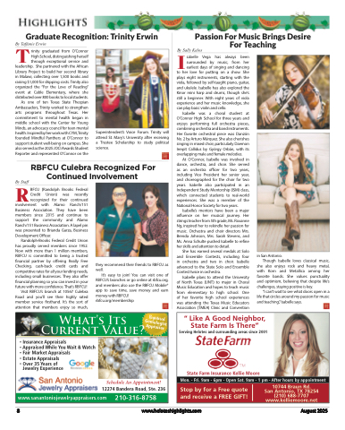 Graduate Recognition: Trinity ErwinPassion For Music Brings DesireBTy Taffanie Erwinrinity graduated from O’Connor High School, distinguishing herself through exceptional service andleadership. She partnered with the African Library Project to build her second library in Malawi, collecting over 1,500 books and raising $1,000 for shipping costs. Trinity also organized the “For the Love of Reading” event at Cable Elementary, where she distributed over 800 books to local students.As one of ten Texas State Thespian Ambassadors, Trinity worked to strengthen arts programs throughout Texas. Her commitment to mental health began in middle school with the Center for Young Minds, an advocacy council for teen mental health. Inspired by her work with CYM, Trinity founded Mindful Panthers at O’Connor to support student well-being on campus. She also served as the 2025 JOCI Awards Student Reporter and represented O’Connor on theSuperintendent’s Voice Forum. Trinity will attend St. Mary’s University after receiving a Trustee Scholarship to study political science.For TeachingIBy Sally Kalossabelle Vega has always been surrounded by music, from her earliest days of singing and dancingto her love for putting on a show. She plays eight instruments, starting with the viola, followed by self-taught piano, guitar, and ukulele. Isabelle has also explored the Kinor mini harp and drums, though she’s still a beginner. With eight years of viola experience and her music knowledge, she can play basic violin and cello.Isabelle was a choral student at O’Connor High School for three years and enjoys performing full orchestra pieces, combining orchestra and band instruments. Her favorite orchestral piece was Danzón No. 2 by Arturo Márquez. She also cherishes singing in mixed choir, particularly Daemon Irrepit Callidus by György Orbán, with its overlapping male and female melodies.At O’Connor, Isabelle was involved in dance, orchestra, and choir. She served as an orchestra officer for two years, including Vice President her senior year, and choreographed for the choir for two years. Isabelle also participated in an Independent Study Mentorship (ISM) class, which connected students to real-world experiences. She was a member of the National Honor Society for two years.Isabelle’s mentors have been a major influence on her musical journey. Her strings teacher from 5th grade, Ms. Roxanne Ng, inspired her to rekindle her passion for music. Orchestra and choir directors Mrs. Brenda Johnson, Mrs. Sarah Stevens, and Ms. Anna Schulte pushed Isabelle to refine her skills and attention to detail.She has earned several medals at Solo and Ensemble Contests, including four in orchestra and two in choir. Isabelle advanced to the State Solo and Ensemble Contest twice in orchestra.Isabelle plans to attend the University of North Texas (UNT) to major in Choral Music Education and hopes to teach music from elementary to high school. One of her favorite high school experiences was attending the Texas Music Educators Association (TMEA) Clinic and ConventionRBFCU Culebra Recognized For Continued Involvementy StaffBR BFCU (Randolph Brooks FederalDevelopment Officer.Randolph-Brooks Federal Credit Unionhas proudly served members since 1952. Now with more than 1 million members, RBFCU is committed to being a trusted financial partner by offering Really Free Checking, cash-back credit cards and competitive rates for all your lending needs, including small businesses. They also offer financial planning so you can invest in your future with more confidence. That’s RBFCU!Visit RBFCU’s branch at 10567 Culebra Road and you’ll see their highly rated member service firsthand. It’s the sort of attention that members enjoy so much,recently recognized for their continued involvement with Alamo Ranch/151 Business Association. They have been members since 2015 and continue to support the community and Alamo Ranch/151 Business Association. A lapel pin was presented to Brianda Garza, BusinessCredit Union) wasthey recommend their friends to RBFCU as well.It’s easy to join! You can visit one of RBFCU’s branches or go online at rbfcu.org, and members also use the RBFCU Mobile® app to save time, save money and earn money with RBFCU!rbfcu.org/membershipin San Antonio.Though Isabelle loves classical music,she also enjoys rock and heavy metal, with Korn and Metallica among her favorite bands. She values punctuality and optimism, believing that despite life’s challenges, staying positive is key.“I can’t wait to see what doors open in a life that circles around my passion for music and teaching,” Isabelle says.What’s Its Current Value?• Insurance Appraisals• Appraised While You Wait & Watch • Fair Market Appraisals• Estate Appraisals• Over 35 Years of Jewelry ExperienceSchedule An Appointment!12274 Bandera Road, Ste. 236www.sanantoniojewelryappraisers.com210-316-8758“ Like A Good Neighbor, State Farm Is There”Serving Helotes and surrounding areas since 2001State Farm Insurance Kellie MooreMon. - Fri. 9am - 6pm • Open Sat. 9am - 1 pm • After hours by appointmentStop by for a Free quote and receive a FREE GIFT!10744 Braun Rd. San Antonio, TX 78254 (210) 688-7707 www.kelliemoore.net8www.heloteshighlights.comAugust 2025RegisteredGemologist Appraiser