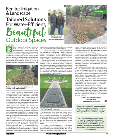 zeroscapingBy Sally KalosB Benitez Irrigation & Landscape, founded in 2020, has quickly earned a reputation for excellence with a 5.0 Google rating from over 150 reviews. However, Hugo Benitez has been serving homeowners in the irrigation industry for over 15 years. Before launching his own business, Hugo honed his expertise working in irrigation repairs and installations for contractors. Today, he and his wife, Roxana, work as a dynamic husband-and-wife team. While Hugo oversees all the projects, Roxana manages the orders, paperwork, andinspections.Custom designed sprinkler systems by our licensed team of professionals.The company specializes in custom irrigation system installations tailored to each homeowner’s landscape, ensuring the system is suited to the unique needs of the area. This means no cookie-cutter solutions. They take into account soil type, water company regulations, and even customer preferences for specific brands. In addition to new installations, Benitez Irrigation & Landscape also offers upgrades to existing sprinkler systems and repairs.With ongoing water restrictions, the company has expanded its services to include landscaping. They’ve embraced “Xeriscape” which combines rocks and drought- tolerant plants in place of grass, especially in shaded areas where grass struggles to grow. The most popular services are the combined sprinkler system installations and landscaping, where homeowners seek low-maintenance, water-efficient solutions.When choosing a landscaping or irrigation company, Hugo and Roxana emphasize the importance of selecting a company that’s easy to find and well-established. A professional company should have a strong online presence—when you search for them on Google, Yelp, or other platforms, they should be easy to locate and backed by positive reviews. Benitez Irrigation & Landscape stands out by offering various sprinkler systems, includingHugo Benitez and Roxana Nazario , husband and wife team.traditional systems and more advanced smart systems that can be controlled remotely via a mobile phone.If a homeowner already has an older sprinkler system, the company can often upgrade it without needing to replace the entire system. Sometimes, upgrading the wall panel to a smart system is all that’s needed to integrate new technology, but older systems may require additional work depending on wiring compatibility.One surprising fact about Benitez Irrigation & Landscape is Roxana’s shift from a career as a nurse practitioner to working full-time in the family business. Though the transition to a new industry was significant, Roxana found a deep sense of purpose in helping Hugo with his growing business. She was drawn in by Hugo’s vision and the need for more hands-on support, and now she is fully involved in consultations, job walk-throughs, ordering materials, and even designing irrigation systems.Useful backyard living spaces.Benitez Irrigation & Landscape takes pride in being a hands-on company. Unlike larger businesses, Hugo and Roxana are personally involved in each project, ensuring that the work is done to their high standards. They believe in investing in continuous training and mentoring, which not only enhances the skills of their employees but also fosters a strong sense of care and commitment to every project.For Roxana, the shift from healthcare to landscaping and irrigation has been rewarding. She enjoys seeing the positive reactions from homeowners when their outdoor spaces are transformed. A memorable project for her wascreating a memorial garden with two special trees for a family who had recently moved from upstate. The trees symbolized a tribute to their late children, and this deeply personal project stood out to Roxana.Hugo shares a similar passion for the business, but his focus is on the growth and development of their team. He takes great pride in seeing his employees hone their skills and grow in their roles, and he actively encourages them to take part in training opportunities. Hugo’s leadership is about more than just completing projects; it’s about fostering a positive work culture where his team feels valued and supported.One of the company’s core values is water conservation. With San Antonio’s ongoing water restrictions, Benitez Irrigation & Landscape is committed to providing solutions that not only save water but also enhance the beauty of their clients’outdoor spaces. Homeowners are encouraged to plant grass in the spring or fall to ensure that their landscapes thrive within the water limitations.Benitez Irrigation & Landscape offers free consultations for new projects, ensuring that every customer receives personalized advice and recommendations based on their specific needs. Their focus on quality, customer service, and sustainability sets them apart in the industry.In summary, Benitez Irrigation & Landscape is a customer-focused, family-run business that prides itself on offering tailored irrigation and landscaping solutions. With a strong commitment to quality, sustainability, and service, they have earned a loyal customer base and continue to grow their business.Benitez Irrigation & Landscape (210) 791-6788 www.benitezirrigation.com“They did an amazing job! I am super pleased with their communication and commitment to doing a good job. I will definitely be getting them again for future projects!” — Evelyn S.“Very pleased with the service. The crew showed up early and worked hard the entire time. They finished ahead of schedule and left the site clean and tidy. Hugo was careful to customize the placement to my specifications. I would highly recommend!!” — Ted SimmonsAugust 2025www.heloteshighlights.com9