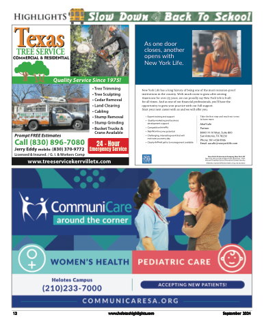 As one door closes, another opens with New York Life.New York Life has a long history of being one of the most recession-proof institutions in the country. With much room to grow after serving Americans for over 175 years, we can proudly say New York Life is builtopportunity to grow your practice with our full support.• Expert training and support• Quality marketing and business development support• Competitive• income potential• Challenging, interesting work that will motivate you every day• Clearly paths to management availableto learn more.Altaf Safri Partner8000 I H-10 West, Suite 800 San Antonio, TX 78230Phone: 901-438-9966Email: aasafri@newyorklife.comNew York Life Insurance Company, New York, NYNew York Life is an Equal Opportunity Employer – M/F/ Veteran/Disability/Sexual Orientation/Gender IdentityAR09261.012018 SMRU5457089.1 (Exp. 02.28.2025)Quality Service Since 1975!Prompt FREE EstimatesCall (830) 896-7080Jerry Eddy mobile: (830) 370-9772Licensed & Insured. / G. I. & Workers Comp• Tree Trimming• Tree Sculpting• Cedar Removal• Land Clearing• Cabling• Stump Removal• Stump Grinding• Bucket Trucks & Crane Available24 - Hour Emergency Servicewww.treeservicekerrvilletx.com12 www.heloteshighlights.com September 2024