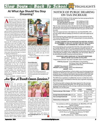 At What Age Should You Stop Dreaming?BAy Sonny Melendrezfew years back, I had the distinct pleasure of serving as the emcee at the opening ceremonies of theInternational Senior Olympic Games, held at San Antonio’s historic Alamo Stadium. It was there I met Harry, a golf enthusiast whose story was both inspiring and unexpected.When I asked Harry how he came to love golf, he shared a charming tale. Despite his friends’ long-standing passion for the sport, Harry was content riding along in the golf cart. One day, he decided to pick up a club, hit a few balls, and, as he put it, “I’ve been hooked ever since.”Curious about his journey, I asked how long ago this newfound passion began. “Twenty-two years ago,” he replied. I was taken aback when he revealed his age at the time: “Eighty.” Now, at 102 years old, Harry still plays golf with the enthusiasm of someone decades younger. His enduring love for the game blossomed well into his senior years, proving that age is no barrier to starting something new.Then there’s Gladys Burrill, who reached the remarkable age of 100 and whose legendary adventurous spirit defied all expectations. A accomplished pilot, horseback rider, and mountain climber, Gladys gained fame for her remarkable achievements in her 90s. At 86, she completed her first marathon, and at 92, she famously finished the Honolulu Marathon after a grueling 9 hours and 53 minutes of power-walking. Her extraordinary feat earned her recognition from Guinness World Records and the Hawaii House of Representatives.These remarkable individuals remindBWy Debbie Seguinords are powerful, but there are few words in life that feel like a bomb exploding.The word cancer is one of them. There are few difficulties in life that can compare with the monumental task of facing that word, fighting that word, surviving that word, overcoming that word. Only those who have experienced this battle can really attest to its steady and insidious toll; a “you had to be there” kind of experience that no one deserves nor is fully prepared for.But surviving this battle – tested warriors become mentors and heroes for those who have yet to fight. These heroes are to be honored for their bravery and tenacity in the face of overwhelming difficulties.We have many women in our own community who have faced this foe, fought this foe, conquered this foe and Highlights publications wants to honor your hero! If you are a breast cancer survivor or know someone who is, please submit a photoNOTICE OF PUBLIC HEARING ON TAX INCREASEA tax rate of $0.310000 per $100 valuation has been proposed by thegoverning body of HELOTES, CITY OF. PROPOSED TAX RATENO-NEW-REVENUE TAX RATE$0.310000 per $100 $0.307683 per $100 $0.316419 per $100VOTER-APPROVAL TAX RATEThe no-new-revenue tax rate is the tax rate for the 2024 tax year thatwill raise the same amount of property tax revenue for HELOTES, CITY OF from the same properties in both the 2023 tax year and the 2024 tax year.The voter-approval rate is the highest tax rate that HELOTES, CITYOF may adopt without holding an election to seek voter approval of the rate.The proposed tax rate is greater than the no-new-revenue tax rate. This means that HELOTES, CITY OF is proposing to increase property taxes for the 2024 tax year.A PUBLIC HEARING ON THE PROPOSED TAX RATE WILL BE HELD ON SEPTEMBER 12, 2024, AT 7:00 PM AT THE CITY HALL COUNCIL CHAMBERS, 12951 BANDERA RD., HELOTES, TX 78023.The proposed tax rate is not greater than the voter-approval tax rate. As a result, HELOTES, CITY OF is not required to hold an election at which voters may accept or reject the proposed tax rate. However, you may express your support for or opposition to the proposed tax rate by contacting the members of the of HELOTES, CITY OF at their offices or by attending the public hearing mentioned above.YOUR TAXES OWED UNDER ANY OF THE RATES MENTIONED ABOVE CAN BE CALCULATED AS FOLLOWS:Property tax amount= (tax rate) x (taxable value of your property)/100FOR the proposal:AGAINST the proposal: PRESENT and not voting: ABSENT:Council Members Craig Sanders,Jen Sones, Dave Cato, Sabrina McGowan, and Matthew Merchant.None.Mayor Rich Whitehead.None.Visit Texas.gov/PropertyTaxes to find a link to your local property tax database on which you can easily access information regarding your property taxes, including information about proposed tax rates and scheduled public hearings of each entity that taxes your property.The 86th Texas Legislature modified the manner in which the voter- approval tax rate is calculated to limit the rate of growth of property taxes in the state.The following table compares the taxes imposed on the average residence homestead by HELOTES, CITY OF last year to the taxes proposed to be imposed on the average residence homestead by HELOTES, CITY OF this year.For assistance with tax calculations, for HELOTES, CITY OF, please contact:The Office of the Bexar County Tax Assessor-Collector Albert Uresti, MPA, PCACCarlos Gutierrez, PCC - Property Tax Division Director 233 N. Pecos-La Trinidad, San Antonio, TX 78207 210-335-6600taxoffice@bexar.org • home.bexar.org/tax2023 2024 CHANGETotal tax rate (per $100 of value) $0.311455 $0.310000 decrease of -0.001455 per $100, or -0.47%Average homestead taxable value $472,326 $505,333 increase of 6.99%Tax on average homestead $1,471.08 $1,566.53 increase of 95.45, or 6.49%Total tax levy on all properties $3,919,900 $3,969,399 increase of 49,499, or 1.26%us that age should never be an obstacle to pursuing dreams or setting new goals. As C.S. Lewis wisely said, “You are never too old to set another goal or to dream a new dream.” So, no matter your age, let your aspirations soar.Here’s to chasing your vision, no matter how old you feel.Sonny Melendrezis an award-winningmotivational speaker,Hall of Fame radio/TV host and author,based in San Antonio.For more of his enthusiastic brand of inspiration and speaking information, visit www.SonnyMelendrez.com a