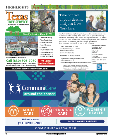 Prompt FREE Estimates• Expert training and support• Quality marketing and business development support• Competitivebenets• Signicant income potential• Challenging, interesting work that will • motivate you every dayClearly dened paths to management availableNew York Life Insurance Company, New York, NYNew York Life is an Equal Opportunity Employer – M/F/ Veteran/Disability/Sexual Orientation/Gender IdentityAR09261.012018 SMRU5457089.1 (Exp. 02.28.2025)Take the rst step and reach out to meto learn more.Altaf Safri Partner8000 IH 10 WestSuite 800San Antonio, TX 78230Call (830) 896-7080Phone: 901-438-9966Jerry Eddy mobile: (830) 370-9772Licensed & Insured. / G. I. & Workers CompEmail: aasafri@newyorklife.com12www.heloteshighlights.com September 2025Quality Service Since 1975!• Tree Trimming• Tree Sculpting• Cedar Removal• Land Clearing• Cabling• Stump Removal• Stump Grinding• Bucket Trucks & Crane Available24 - Hour Emergency ServiceTake control of your destinyand join New York Life.New York Life has a long history of being one of the most recession-proof institutions in the country. With much room to grow after serving Americans for over 175 years, we can proudly say New York Life is built for all times. And as one of our financial professionals, you’ll have the opportunity to grow your practice with our full support.Start your next career with us and we will offer you:www.treeservicekerrvilletx.comaround the cornerPEDIATRIC CARE CAREWOMEN’S HEALTHADULTHelotes Campus(210)233-7000ACCEPTING NEW PATIENTS!COMMUNICARESA.ORG