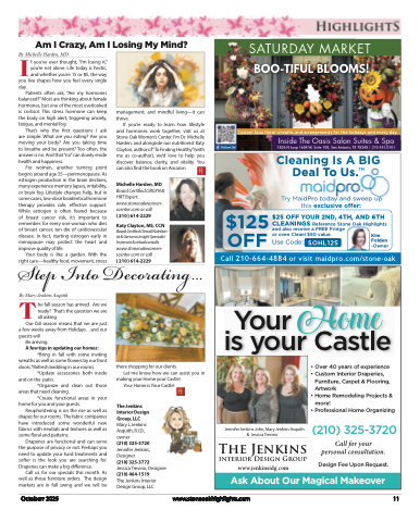 Am I Crazy, Am I Losing My Mind?BIy Michelle Harden, MDf you’ve ever thought, “I’m losing it,” you’re not alone. Life today is hectic, and whether you’re 15 or 85, the wayyou live shapes how you feel every single day.Patients often ask, “Are my hormones balanced?” Most are thinking about female hormones, but one of the most overlooked is cortisol. This stress hormone can keep the body on high alert, triggering anxiety, fatigue, and mental fog.That’s why the first questions I ask are simple: What are you eating? Are you moving your body? Are you taking time to breathe and be present? Too often, the answer is no. And that “no” can slowly erode health and happiness.For women, another turning point begins around age 35—perimenopause. As estrogen production in the brain declines, many experience memory lapses, irritability, or brain fog. Lifestyle changes help, but in some cases, low-dose bioidentical hormone therapy provides safe, effective support. While estrogen is often feared because of breast cancer risk, it’s important to remember: for every one woman who dies of breast cancer, ten die of cardiovascular disease. In fact, starting estrogen early in menopause may protect the heart and improve quality of life.SATURDAY MARKETBOO-TIFUL BLOOMS!Custom faux floral wreaths and arrangements for the holidays and every day.$125 OFFCleaning Is A BIG Deal To Us.TMTry MaidPro today and sweep up this exclusive offer:$25 OFF YOUR 2ND, 4TH, AND 6THCLEANINGS Reference Stone Oak Highlights and also receive a FREE FridgeInside The Oasis Salon Suites & Spa1826 N Loop 1604 W, Suite 100, San Antonio, TX 78248 | 210.951.0101or oven Clean! $50 value.Use Code: SOHL125Kim Folden -OwnerCall 210-664-4884 or visit maidpro.com/stone-oakYour Home is your CastleJennifer Jenkins John, Mary Jenkins Asquith & JessicaTrevinoThe Jenkins interior Design Group www.jenkinsidg.com• Over 40 years of experience • Custom Interior Draperies,Furniture, Carpet & Flooring,Artwork• Home Remodeling Projects &more!• Professional Home Organizing(210) 325-3720Call for your personal consultation.Design Fee Upon Request.Ask About Our Magical Makeovermanagement, and mindful living—it can thrive.If you’re ready to learn how lifestyle and hormones work together, visit us at Stone Oak Women’s Center. I’m Dr. Michelle Harden, and alongside our nutritionist Katy Clayton, author of“To Finding Healthy”(with me as co-author), we’d love to help you discover balance, clarity, and vitality. You can also find the book on Amazon.Michelle Harden, MDBoard Certified OBGYN & HRT Expert. www.stoneoakwomen- scenter.com or call( 210 ) 614-2229Katy Clayton, MS, CCNBoard Certified Clinical Nutrition- ist & Genomic Insight Specialist In-person & virtual consults www.stoneoakwomen- scenter.com or callYour body is like a garden. With theright care—healthy food, movement, stress ( 210 ) 614-2229Step Into Decorating...TBy Mary Jenkins Asquithhe fall season has arrived. Are we ready? That’s the question we are all asking.Our fall season means that we are just a few weeks away from Holidays...and our guests willBe arriving.A few tips in updating our homes:*Bring in fall with some inviting wreaths as well as some flowers by our front doors.*Refresh bedding in our rooms.*Update accessories both inside and on the patio.*Organize and clean out those areas that need cleaning.*Create functional areas in your home for you and your guests.Reupholstering is on the rise as well as drapes for our rooms. The fabric companies have introduced some wonderful new fabrics with neutrals and textures as well as some floral and patterns.Draperies are functional and can serve the purpose of privacy or not. Perhaps you need to update your hard treatments and softer is the look you are searching for. Draperies can make a big difference.Call us for our specials this month. As well as those furniture orders. The design markets are in full swing and we will bethere shopping for our clients.Let me know how we can assist you inmaking your Home your Castle! Your Home is Your Castle!The Jenkins Interior Design Group, LLC Mary L Jenkins Asquith, R.I.D., owner(210) 325-3720Jennifer Jenkins, Designer(210) 325-3772Jessica Trevino, Designer (210) 464-1519The Jenkins Interior Design Group, LLCOctoberr 2025www.stoneoakhighlights.com 11