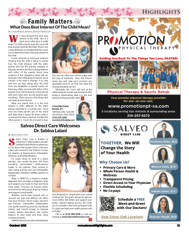 vFamily Mattersv What Does Best Interest Of The Child Mean?WBy Crista Branch, Attorney, Branch Family Lawe have all heard the term best interest of the child. But in a legal sense what does it reallymean? In child custody cases, the court will look at what is best for the child. There is not a clear definition or standard that the courts use to determine what is the best interest of the childCourts will looks at and want evidence showing how the child is doing in school; how the child interacts with the other parent; who has the primary caregiver in the past; are there alcohol or drug problems with either of the parents (must have evidence of this- allegations alone will not hold up); is the child going to have to move schools; is the child in therapy- if so, why and how are they doing; does the child have any disabilities or special needs; are there any safety concerns with either of the parents; how well do parents communicate with each other and are the parents bad- mouthing. These are just a few things that can make up best interest.What one parent feels is in the best interest is often different to the other parent, especially In a custody case. I have seen too many parents get on the stand and state what is better for them, what is convenient for them and how horrible the other parent is. Courts do not want to hearGetting You Back To The Things You Love, FASTER!Physical Therapy & Sports RehabYour premier physical therapy provider for one -on-one care.www.promotionpt-sa.com5 locations serving San Antonio & surrounding areas 210-257-8272Salveo Direct Care WelcomesDr. Sabina LalaniBSy Salveo Direct Carealveo Direct Care is thrilled to welcome Dr. Sabina Lalani, a board- certified Family Medicine physician,to our Stone Oak location! She’s a Houston native who moved to San Antonio to earn her degrees in Neuroscience, Osteopathic Medicine, and Family Medicine.Dr. Lalani chose to work in a direct primary care model because she loves providing personalized whole-person health to her patients. She’s excited to start seeing primary care and Osteopathic Manipulative Medicine (OMM) patients in October.What is OMM? It’s a hands-on holistic approach that can help us diagnose, treat, and support your body to heal and move more easily. It focuses on muscles, joints, and nerves to reduce pain, improve motion, and support overall health.Whether you’ve been injured, sick, or stressed out, pain and stiffness can affect how your muscles, nerves, lungs, and even gut function. Osteopathic manipulation uses gentle stretching, pressure, myofascial release, and muscle energy to improve motion, reduce discomfort, and restore balance to your body and treat many common ailments.OMM treatments are safe, individualized,Octoberr 2025Prisiliano Salas, M.D.this, you can often turn off the judge with this type of testimony. Now, that doesn't mean you can’t state your concerns, you absolutely need to do that, but keep the emotional hatred out of it.Ultimately, the Court will look at the child’s physical, mental and emotional well- being in determining what is in the best interest of that particular child.Crista Marichalar Branch, P.C.549 Heimer Rd., Suite 200 San Antonio, Texas 78232 (210) 229-2088 www.branchfamilylaw.comand designed to complement your overall medical care. The goal is always to help you move better, feel better, and support your body’s natural healing process. We invite you to schedule a free meet-and-greet with Dr. Lalani and start your health journey with us today!Call us at (210) 899-2549 or visit our website at www.SalveoDirectCare.com.Monica Salas, M.D.Sabina Lalani, D.O.Sharvari Parghi, M.D.13TOGETHER, We Will Change the Story of Your HealthWhy Choose Us?Primary Care & MoreWhole Person Health & WellnessTransparent PricingDirect Access to Your Physician Flexible SchedulingNo Co-paysSchedule a FREE Meet-and-Greet with Our Doctors!New Stone Oak Location! www.stoneoakhighlights.com