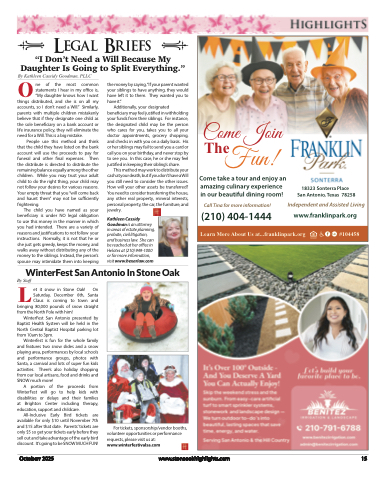 Legal Briefs“I Don’t Need a Will Because My Daughter Is Going to Split Everything.”OBy Kathleen Cassidy Goodman, PLLCne of the most common statements I hear in my office is, “My daughter knows how I wantthings distributed, and she is on all my accounts, so I don’t need a Will.” Similarly, parents with multiple children mistakenly believe that if they designate one child as the sole beneficiary on a bank account or life insurance policy, they will eliminate the need for a Will. This is a big mistake.People use this method and think that the child they have listed on the bank account will use the proceeds to pay for funeral and other final expenses. Then the distribute is directed to distribute the remaining balance equally among the other children. While you may trust your adult child to do the right thing, your child may not follow your desires for various reasons. Your empty threat that you “will come back and haunt them” may not be sufficiently frightening.The child you have named as your beneficiary is under NO legal obligation to use this money in the manner in which you had intended. There are a variety of reasons and justifications to not follow your instructions. Normally, it is not that he or she just gets greedy, keeps the money, and walks away without distributing any of the money to the siblings. Instead, the person’s spouse may intimidate them into keepingCome JoinTheFun!Come take a tour and enjoy an amazing culinary experience in our beautiful dining room!Call Tina for more information!(210) 404-144418323 Sonterra Place San Antonio, Texas 78258Independent and Assisted Livingwww.franklinpark.orgLearn More About Us at...franklinpark.org#104458OPPORTUNITYthe money by saying, “If your parent wanted your siblings to have anything, they would have left it to them. They wanted you to have it.”Additionally, your designated beneficiary may feel justified in withholding your funds from their siblings. For instance, the designated child may be the person who cares for you, takes you to all your doctor appointments, grocery shopping, and checks in with you on a daily basis. His or her siblings may fail to send you a card or call you on your birthday, and never stop by to see you. In this case, he or she may feel justified in keeping their sibling’s share.This method may work to distribute your cash at your death, but if you don’t have a Will you still need to consider the other issues. How will your other assets be transferred? You need to consider transferring the house, any other real property, mineral interests, personal property, the car, the furniture, and jewelry.Kathleen Cassidy Goodman is an attorney in areas of estate planning, probate, civil litigation, and business law. She can be reached at her office in Helotes at (210) 949-1000 or for more information, visit www.bexarlaw.comWinterFest San Antonio In Stone Oaky Staff BLbringing 80,000 pounds of snow straight from the North Pole with him!WinterFest San Antonio presented by Baptist Health System will be held in the North Central Baptist Hospital parking lot from 10am to 3pm.Winterfest is fun for the whole family and features two snow slides and a snow playing area, performances by local schools and performance groups, photos with Santa, a carnival and lots of super fun kids activities. There’s also holiday shopping from our local artisans, food and drinks and SNOW much more!A portion of the proceeds from WinterFest will go to help kids with disabilities or delays and their families at Brighton Center including therapy, education, support and childcare.All-Inclusive Early Bird tickets are available for only $10 until November 7th and$15afterthatdate. Parents’ticketsare only $5 so get your tickets early before they sell out and take advantage of the early bird discount. It’sgoingtobeSNOWMUCHFUN!et it snow in Stone Oak! On Saturday, December 6th, Santa Claus is coming to town andFor tickets, sponsorship/vendor booths, volunteer opportunities or performance requests, please visit us at: www.winterfestivalsa.comOctoberr 2025www.stoneoakhighlights.com 15EQUAL HOUSING
