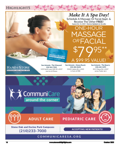 .Make It A Spa Day!Schedule A Massage Or Facial Appt. & Receive The Other FREE!Expires Oct. 31, 2025 - Mention Highlights for the offer.ONE-HOUR MASSAGE OR FACIAL$7995** A $99.95 VALUE!San Antonio - The Vineyard 210-963-75011435 North Loop 1604 W • #107 next to LA FitnessSan Antonio - Alamo Ranch 210-202-063019650 Culebra Rd. • #103in front of HEBSan Antonio - The Quarry 210-610-1293355 E. Basse Rd. • #107 across Trader Joe’s•Stone Oak and Encino Park Campuses-16 www.stoneoakhighlights.com October 2025