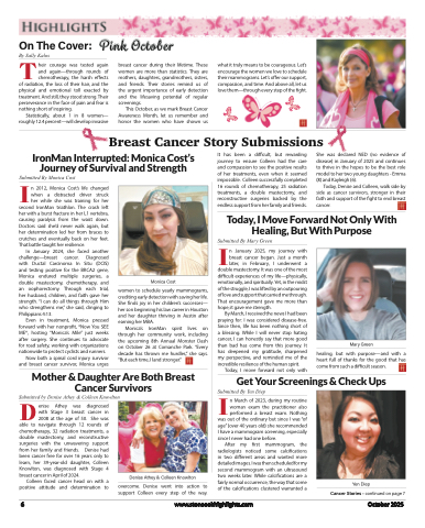 OnTheCover: PinkOctober y Sally KalosBTheir courage was tested again and again—through rounds of chemotherapy, the harsh effectsof radiation, the loss of their hair, and the physical and emotional toll exacted by treatment. And still, they stood strong. Their perseverance in the face of pain and fear is nothing short of inspiring.Statistically, about 1 in 8 women— roughly 12.4 percent—will develop invasivebreast cancer during their lifetime. These women are more than statistics. They are mothers, daughters, grandmothers, sisters, and friends. Their stories remind us of the urgent importance of early detection and the lifesaving potential of regular screenings.This October, as we mark Breast Cancer Awareness Month, let us remember and honor the women who have shown uswhat it truly means to be courageous. Let’s encourage the women we love to schedule their mammograms. Let’s offer our support, compassion, and time. And above all, let us love them—through every step of the fight.IronMan Interrupted: Monica Cost’s Journey of Survival and StrengthISubmitted By Monica Costn 2012, Monica Cost’s life changed when a distracted driver struck her while she was training for hersecond IronMan triathlon. The crash left her with a burst fracture in her L1 vertebra, causing paralysis from the waist down. Doctors said she’d never walk again, but her determination led her from braces to crutches and eventually back on her feet. That battle taught her resilience.In January 2024, she faced another challenge—breast cancer. Diagnosed with Ductal Carcinoma In Situ (DCIS) and testing positive for the BRCA2 gene, Monica endured multiple surgeries, a double mastectomy, chemotherapy, and an oophorectomy. Through each trial, her husband, children, and faith gave her strength. “I can do all things through Him who strengthens me,” she said, clinging to Philippians 4:13.Even in treatment, Monica pressed forward with her nonprofit, *Now You SEE ME*, hosting “Monica’s Mile” just weeks after surgery. She continues to advocate for road safety, working with organizations nationwide to protect cyclists and runners.Now both a spinal cord injury survivor and breast cancer survivor, Monica urgesIt has been a difficult, but rewarding journey to ensure Colleen had the care and compassion to see the positive results of her treatments, even when it seemed impossible. Colleen successfully completed 16 rounds of chemotherapy, 25 radiation treatments, a double mastectomy, and reconstructive surgeries backed by the endless support from her family and friends.She was declared NED (no evidence of disease) in January of 2025 and continues to thrive in the hopes to be the best role model to her two young daughters - Emma (8) and Kayleigh (6).Today, Denise and Colleen, walk side by side as cancer survivors, stronger in their faith and support of the fight to end breast cancer.Breast Cancer Story SubmissionsMonica Costwomen to schedule yearly mammograms, crediting early detection with saving her life. She finds joy in her children’s successes— her son beginning his law career in Houston and her daughter thriving in Austin after earning her MBA.Monica’s IronMan spirit lives on through her community work, including the upcoming 8th Annual Monster Dash on October 26 at Comanche Park. “Every decade has thrown me hurdles,” she says. “But each time, I land stronger.”SIubmitted By Mary Greenn January 2025, my journey with breast cancer began. Just a month later, in February, I underwent adouble mastectomy. It was one of the most difficult experiences of my life—physically, emotionally, and spiritually. Yet, in the midst of the struggle, I was lifted by an outpouring of love and support that carried me through. That encouragement gave me more than hope; it gave me strength.By March, I received the news I had been praying for: I was considered disease-free. Since then, life has been nothing short of a blessing. While I will never stop hating cancer, I can honestly say that more good than bad has come from this journey. It has deepened my gratitude, sharpened my perspective, and reminded me of the incredible resilience of the human spirit.Today, I move forward not only withMary Greenhealing, but with purpose—and with a heart full of thanks for the good that has come from such a difficult season.Today, I Move Forward Not Only With Healing, But With PurposeMother & Daughter Are Both Breast Cancer SurvivorsGet Your Screenings & Check UpsSD enise Athey was diagnosed with Stage 3 breast cancer in 2008 at the age of 50. She was able to navigate through 12 rounds of chemotherapy, 32 radiation treatments, a double mastectomy, and reconstructive surgeries with the unwavering support from her family and friends. Denise had been cancer free for over 16 years only to learn, her 39-year-old daughter, Colleen Knowlton, was diagnosed with Stage 4 breast cancer in April of 2024.Colleen faced cancer head on with a positive attitude and determination to6Iubmitted by Denise Athey & Colleen Knowltonn March of 2023, during my routine woman exam the practitioner also performed a breast exam. NothingSubmitted By Yen DiepDenise Athey & Colleen Knowltonovercome. Denise went into action to support Colleen every step of the way.was out of the ordinary but since I was “of age” (over 40 years old) she recommended I have a mammogram screening, especially since I never had one before.After my first mammogram, the radiologists noticed some calcifications in two different areas and wanted more detailed images. I was then scheduled for my second mammogram with an ultrasound two weeks later. While calcifications are a fairly normal occurrence, the way that some of the calcifications clustered warranted aYen DiepCancer Stories - continued on page 7 October 2025www.stoneoakhighlights.com