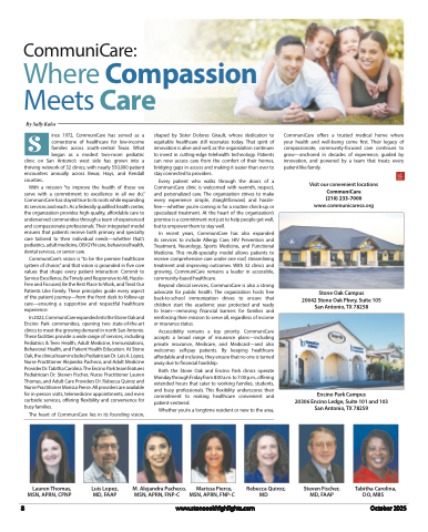 CommuniCare:Where Compassion Meets CareBy Sally KalosS ince 1972, CommuniCare has served as a cornerstone of healthcare for low-income families across south-central Texas. What began as a modest two-room pediatric clinic on San Antonio’s west side has grown into a thriving network of 32 clinics, with nearly 550,000 patient encounters annually across Bexar, Hays, and Kendallcounties..With a mission “to improve the health of those we serve with a commitment to excellence in all we do,” CommuniCare has stayed true to its roots while expanding its services and reach. As a federally qualified health center, the organization provides high-quality, affordable care to underserved communities through a team of experienced and compassionate professionals. Their integrated model ensures that patients receive both primary and specialty care tailored to their individual needs—whether that’s pediatrics, adult medicine, OB/GYN care, behavioral health, dental services, or senior care.CommuniCare’s vision is “to be the premier healthcare system of choice,” and that vision is grounded in five core values that shape every patient interaction: Commit to Service Excellence, Be Timely and Responsive to All, Hassle- Free and Focused, Be the Best Place to Work, and Treat Our Patients Like Family. These principles guide every aspect of the patient journey—from the front desk to follow-up care—ensuring a supportive and respectful healthcare experience.In 2022, CommuniCare expanded into the Stone Oak and Encino Park communities, opening two state-of-the-art clinics to meet the growing demand in north San Antonio. These facilities provide a wide range of services, including Pediatrics & Teen Health, Adult Medicine, Immunizations, Behavioral Health, and Patient Health Education. At Stone Oak, the clinical team includes Pediatrician Dr. Luis A. Lopez, Nurse Practitioner Alejandra Pacheco, and Adult Medicine Provider Dr. Tabitha Carolina. The Encino Park team features Pediatrician Dr. Steven Fischer, Nurse Practitioner Lauren Thomas, and Adult Care Providers Dr. Rebecca Quiroz and Nurse Practitioner Marissa Pierce. All providers are available for in-person visits, telemedicine appointments, and even curbside services, offering flexibility and convenience for busy families.The heart of CommuniCare lies in its founding vision,shaped by Sister Dolores Girault, whose dedication to equitable healthcare still resonates today. That spirit of innovation is alive and well, as the organization continues to invest in cutting-edge telehealth technology. Patients can now access care from the comfort of their homes, bridging gaps in access and making it easier than ever to stay connected to providers.Every patient who walks through the doors of a CommuniCare clinic is welcomed with warmth, respect, and personalized care. The organization strives to make every experience simple, straightforward, and hassle- free—whether you’re coming in for a routine check-up or specialized treatment. At the heart of the organization’s promise is a commitment not just to help people get well, but to empower them to stay well.In recent years, CommuniCare has also expanded its services to include Allergy Care, HIV Prevention and Treatment, Neurology, Sports Medicine, and Functional Medicine. This multi-specialty model allows patients to receive comprehensive care under one roof, streamlining treatment and improving outcomes. With 32 clinics and growing, CommuniCare remains a leader in accessible, community-based healthcare.Beyond clinical services, CommuniCare is also a strong advocate for public health. The organization hosts free back-to-school immunization drives to ensure that children start the academic year protected and ready to learn—removing financial barriers for families and reinforcing their mission to serve all, regardless of income or insurance status.Accessibility remains a top priority. CommuniCare accepts a broad range of insurance plans—including private insurance, Medicare, and Medicaid—and also welcomes self-pay patients. By keeping healthcare affordable and inclusive, they ensure that no one is turned away due to financial hardship.Both the Stone Oak and Encino Park clinics operate Monday through Friday from 8:00 a.m. to 7:00 p.m., offering extended hours that cater to working families, students, and busy professionals. This flexibility underscores their commitment to making healthcare convenient and patient-centered.Whether you’re a longtime resident or new to the area,CommuniCare offers a trusted medical home where your health and well-being come first. Their legacy of compassionate, community-focused care continues to grow—anchored in decades of experience, guided by innovation, and powered by a team that treats every patient like family.Visit our convenient locationsCommuniCare (210) 233-7000 www.communicaresa.orgStone Oak Campus20642 Stone Oak Pkwy, Suite 105 San Antonio, TX 78258Encino Park Campus20306 Encino Ledge, Suite 101 and 103 San Antonio, TX 78259Lauren Thomas, MSN, APRN, CPNPLuis Lopez, MD, FAAPM. Alejandra Pacheco, Marissa Pierce, Rebecca Quiroz,Steven Fischer, MD, FAAPTabitha Carolina, DO, MBSMSN, APRN, FNP-C MSN, APRN, FNP-CMD8www.stoneoakhighlights.comOctober 2025