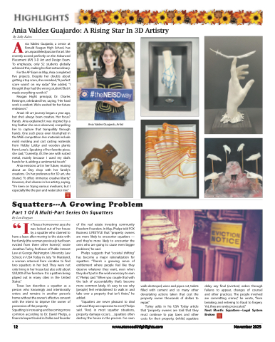 Ania Valdez Guajardo: A Rising Star In 3D ArtistryBy Sally KalosAnia Valdez Guajardo, a senior at Ronald Reagan High School, has an unparalleled passion for art. She recently scored perfectly on the Advanced Placement (AP) 3-D Art and Design Exam. To emphasize, only 52 students globally achieved this, making her feat extraordinary.For the AP Exam in May, Ania completed five projects. Despite her doubts about getting a top score, she remarked,“A perfect score wasn’t on my radar.” She added, “I thought they had the wrong student! But it made everything worth it.”Reagan High’s principal, Dr. Charles Reininger, celebrated her, saying, “Her hard work is evident. We’re excited for her future endeavors.”Ania’s 3D art journey began a year ago, but she’s always been creative. Her focus? Hands. Ania explained it was inspired by a tiny feather she once observed, compelling her to capture that tranquillity through hands. One such piece even triumphed in the VASE competition. Her materials include mold molding and cast casting materials from Hobby Lobby and wooden planks from Lowe’s. Speaking of her favorite piece, she said, “Currently, it’s the one with rusted metal, mainly because I used my dad’s hands for it, adding a sentimental touch.”Ania envisions art in her future, musing about an Etsy shop with her family’s creations. On her preference for 3D art, she shared, “It offers immense creative liberty.” However, she’s diverse in her artistry, saying, “I’m keen on trying various mediums, but I especially like the pen and watercolor mix.”Ania Valdez Guajardo, ArtistSquatters---A Growing ProblemPart 1 Of A Multi-Part Series On SquattersBy Lou Duggan“InTexasahomeownersaysshe was locked out of her house by a squatter who claimed to have a lease after moving to the state with her family (the woman previously had been evicted from three other homes),” wrote Jonathan Turley, Professor of Public Interest Law at George Washington University Law School, in USA Today in July. “In Maryland, a woman returned from vacation to find two squatters in her bed. They were not only living in her house but also sold about $50,000 of her furniture. It is a pattern being played out in many cities in the UnitedStates.”Texas law describes a squatter as aperson who knowingly and intentionally enters and remains in another person’s home without the owner’s effective consent with the intent to deprive the owner of possession of the property.Squatting is increasing and becoming more common according to Dr. David Phelps, a financial expert based in Dallas and founderof the real estate investing community Freedom Founders. In May, Phelps told FOX Business LIFESTYLE that “property owners are more likely to encounter squatters — and they’re more likely to encounter the ones who are going to cause even bigger problems,” he said.Phelps suggests that “societal shifting” has become a major rationalization for squatters. “There’s a growing sense of entitlement where people feel like they deserve whatever they want, even when they don’t put in the work necessary to earn it,” Phelps said. “When you couple that with the lack of accountability that’s become more common lately, it’s easy to see why [people] feel emboldened to walk in and take over a property that isn’t theirs,” he added.“Squatters are never pleasant to deal with and they are expensive to evict,” Phelps said. “And, in most squatter situations, property damage occurs....squatters often destroy the house in the process. I’ve seenwalls destroyed, wires and pipes cut, toilets filled with cement and so many other devastating actions taken that cost the property owner thousands of dollars to repair.”Turley adds in his USA Today article that “property owners are told that they must continue to pay taxes and other costs for their property, (while) squattersdelay any final (eviction) orders through failures to appear, changes of counsel and other practices. The people involved are committing crimes,” he wrote, “from breaking and entering to fraud to forgery. Yet, they are rarely prosecuted.”Next Month: Squatters---Legal System Broken12www.stoneoakhighlights.comNovember 2023