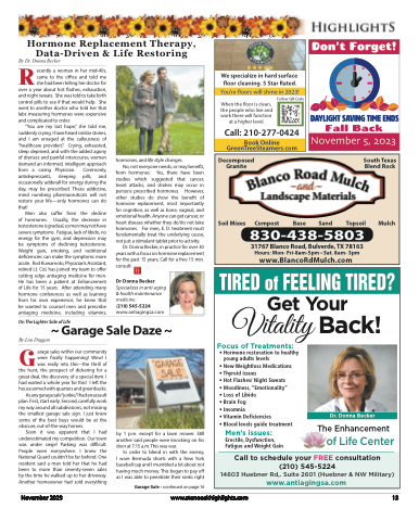 Hormone Replacement Therapy, Data-Driven & Life RestoringRBy Dr. Donna Beckerecently a woman in her mid-40s, came to the office and told me she had been telling her doctor forover a year about hot flashes, exhaustion, and night sweats. She was told to take birth control pills to see if that would help. She went to another doctor who told her that labs measuring hormones were expensive and complicated to order.“You are my last hope,” she told me, suddenly crying. I have heard similar stories, and I am enraged at the callousness of “healthcare providers”. Crying, exhausted, sleep deprived, and with the added agony of dryness and painful intercourse, women demand an informed, intelligent approach from a caring Physician. Commonly, antidepressants, sleeping pills, and occasionally adderall for energy during the day, may be prescribed. These addictive, mind numbing pharmaceuticals will not restore your life—only hormones can do that!Men also suffer from the decline of hormones. Usually, the decrease in testosterone is gradual, so men may not have severe symptoms. Fatigue, lack of libido, no energy for the gym, and depression may be symptoms of declining testosterone. Weight gain, smoking, and nutritional deficiencies can make the symptoms more acute. Rod Kuwamoto, Physician’s Assistant, retired Lt. Col, has joined my team to offer cutting edge antiaging medicine for men. He has been a patient at Enhancement of Life for 15 years. After attending many hormone conferences as well as learning from his own experience, he knew that he wanted to counsel men and prescribe antiaging medicine, including vitamins,On The Lighter Side of LifeBy Lou DugganGarage sales within our community were finally happening! Wow! I was really into this---the thrill of the hunt, the prospect of dickering for a great deal, the discovery of a special item. I had waited a whole year for this! I left the house armed with quarters and greenbacks.As any garage sale“junkie,”I had an assault plan. First, start early. Second, carefully work my way around all subdivisions, not missing the smallest garage sale sign. I just knew some of the best buys would be at the obscure, out-of-the-way homes.Soon it was apparent that I had underestimated my competition. Our town was under siege! Parking was difficult. People were everywhere. I knew the National Guard couldn’t be far behind. One resident said a man told her that he had been to more than seventy-seven sales by the time he walked up to her driveway. Another homeowner had sold everythingNovember 2023We specialize in hard surface floor cleaning. 5 Star Rated.You’re floors will shine in 2023!When the floor is clean, the people who live and work there will function at a higher level.Follow QR CodeCall: 210-277-0424Book Online GreenTreeSteamers.comFall BackDecomposed GraniteSoil MixesCompostBase SandSouth Texas Blend RockMulch830-438-580331767 Blanco Road, Bulverde, TX 78163 Hours: Mon- Fri-8am-5pm • Sat. 8am- 3pmwww.BlancoRdMulch.comTopsoilGet Your Vitality Back!Focus of Treatments:• Hormone restoration to healthy young adults levels• New Weightloss Medications • Thyroid issues• Hot Flashes/ Night Sweats• Moodiness, “Emotionality” • Loss of Libido• Brain Fog• Insomnia• Vitamin Deficiencies• Blood levels guide treatmentMen’s issues:Erectile, Dysfunction, Fatigue and Weight GainThe Enhancementof Life CenterDr. Donna BeckerCall to schedule your FREE consultation (210) 545-522414603 Huebner Rd,. Suite 2601 (Huebner & NW Military)www.antiagingsa.comhormones, and life style changes.No, not everyone needs, or may benefit,from hormones. Yes, there have been studies which suggested that cancer, heart attacks, and strokes may occur in persons prescribed hormones. However, other studies do show the benefit of hormone replacement, most importantly for cognition, as well as bone, vaginal, and emotional health. Anyone can get cancer, or heart disease whether they do/do not take hormones. For men, E. D. treatment must fundamentally treat the underlying cause, not just a stimulant tablet prior to activity.Dr. Donna Becker, in practice for over 30 years with a focus on hormone replacement for the past 15 years, Call for a free 15 min. consult:Dr Donna BeckerSpecializes in anti-aging & health maintenance medicine.(210) 545-5224 www.antiagingsa.comby 1 p.m. except for a lawn mower. Still another said people were knocking on his door at 7:15 a.m. This was war.In order to blend in with the enemy, I wore Bermuda shorts with a New York baseball cap and I mumbled a lot about not having much money. This began to pay off as I was able to penetrate their ranks rightGarage Sale - continued on page 14www.stoneoakhighlights.com 13