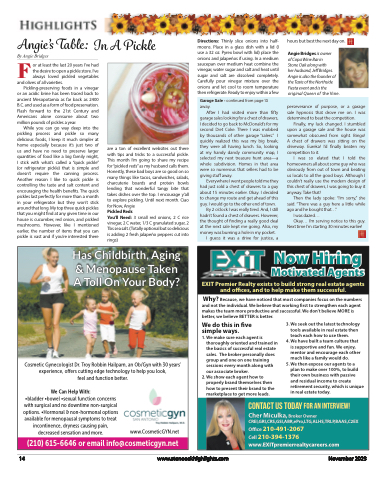 Angie’s Table:or at least the last 20 years I’ve had the desire to open a pickle store. I’ve always loved pickled vegetablesy Angie BridgesIn A PickleDirections: Thinly slice onions into half- moons. Place in a glass dish with a lid (I use a 32 oz. Pyrex bowl with lid) place the onions and jalapeños if using. In a medium saucepan over medium heat combine the vinegar, water sugar and salt and heat until sugar and salt are dissolved completely. Carefully pour vinegar mixture over the onions and let cool to room temperature then refrigerate. Ready to enjoy within a fewhours but best the next day on.Angie Bridges is ownerof Copa Wine Bar inStone Oak along withher husband, Jeff Bridges. Angie is also the founder of the Taste of the Northside Fiesta event and is the original Queen of the Vine.BFand olives of all varieties. Pickling-preserving foods in a vinegaror an acidic brine has been traced back to ancient Mesopotamia as far back as 2400 B.C. and used as a form of food preservation. Flash forward to the 21st Century and Americans alone consume about two million pounds of pickles a year.While you can go way deep into the pickling process and pickle so many delicious foods, I keep it much simpler at home especially because it’s just two of us and have no need to preserve larger quantities of food like a big family might, I stick with what’s called a “quick pickle” (or refrigerator pickle) that is simple and doesn’t require the canning process. Another reason I like to quick pickle is controlling the taste and salt content and encouraging the health benefits. The quick pickles last perfectly for more than a month in your refrigerator but they won’t stick around that long. My top three quick pickles that you might find at any given time in our house is cucumber, red onion, and pickled mushrooms. However, like I mentioned earlier, the number of items that you can pickle is vast and if you’re interested thereare a ton of excellent websites out there with tips and tricks to a successful pickle. This month I’m going to share my recipe for “pickled reds” as my husband calls them. Honestly, these bad boys are so good on so many things like tacos, sandwiches, salads, charcuterie boards and protein bowls lending that wonderful tangy bite that takes dishes over the top. I encourage y’all to explore pickling. Until next month. Ciao for Now, AngiePickled RedsYou’ll Need: 3 small red onions, 2 C rice vinegar, 2 C water, 1/3 C granulated sugar, 2 Tbs sea salt. (Totally optional but so delicious is adding 2 fresh jalapeño peppers cut into rings)Garage Sale - continued from page 13 away.After I had visited more than fifty garage sales looking for a chest of drawers, I decided to go back to McDonald’s for my second Diet Coke. There I was mobbed by thousands of other garage “salers.” I quickly realized this was my big break; they were all having lunch. So, looking at my handy dandy community map, I selected my next treasure hunt area—a whole subdivision. Homes in that area were so numerous that sellers had to be giving stuff away.Everywhere I went people told me they had just sold a chest of drawers to a guy about 15 minutes earlier. Okay. I decided to change my route and get ahead of this guy. I would go to the other end of town.By 2 o’clock I was really tired. And, I still hadn’t found a chest of drawers. However, the thought of finding a really good deal at the next sale kept me going. Also, my money was burning a hole in my pocket.I guess it was a drive for justice, aperseverance of purpose, or a garage sale hypnosis that drove me on. I was determined to beat the competition.Finally, my luck changed. I stumbled upon a garage sale and the house was somewhat obscured from sight. Bingo! A chest of drawers was sitting on the driveway. Eureka! I’d finally beaten my competition to it.I was so elated that I told the homeowners all about some guy who was obviously from out of town and beating us locals to all the good buys. Although I couldn’t really use the modern design of this chest of drawers, I was going to buy it anyway. Take that!Then the lady spoke: “I’m sorry,” she said. “There was a guy here a little while ago and he bought that. . .”Iwasdazed...Okay... I’m serving notice to this guy. Next time I’m starting 30 minutes earlier!Now Hiring Motivated AgentsEXIT Premier Realty exists to build strong real estate agents and offices, and to help make them successful.Why? Because, we have noticed that most companies focus on the numbers and not the individual. We believe that working first to strengthen each agent makes the team more productive and successful. We don’t believe MORE is better, we believe BETTER is better.We do this in five simple ways.1. We make sure each agent isthoroughly oriented and trained in the basics of successful real estate sales. The broker personally does group and one on one training sessions every month along with our associate broker.2. We show each agent how to properly brand themselves then how to present their brand to the marketplace to get more leads.3. We seek out the latest technology tools available in real estate then teach each how to use them.4. We have built a team culture that is supportive and fun. We enjoy, mentor and encourage each other much like a family would do.5. We then expose our agents to a plan to make over 100%, to build their own business with passive and residual income to create retirement security, which is unique in real estate today.Contact Us Today For An Interview!Cher Miculka, Broker Owner CREI,GRI,CRS,GSI,ABR,ePro,LTG,ALHS,TRLP,BAAS,C2EXOffice 210-491-2067Cell 210-394-1376 www.EXITpremierrealtycareers.comCosmetic Gynecologist Dr. Troy Robbin Hailparn, an Ob/Gyn with 30 years’ experience, offers cutting edge technology to help you look,feel and function better.We Can Help With:•bladder •bowel •sexual function concerns with surgical and no downtime non-surgical options. •Hormo