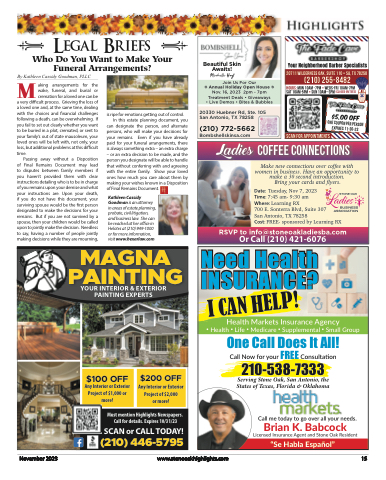 Legal BriefsWho Do You Want to Make Your Funeral Arrangements?Beautiful Skin Awaits! Michelle HoytJoin Us For Our# Annual Holiday Open House # Nov. 16, 2023 2pm - 7pmTreatment Deals • Giveaways • Live Demos • Bites & Bubbles20330 Huebner Rd, Ste. 105 San Antonio, TX 78258(210) 772-5662Bombshellskinsa.comYour Neighborhood Barber Specialists20711 Wilderness Oak, Suite 110 • SA, TX 78258 (210) 255-8482Hours: Mon 10am -7pm • weds-Fri 10am-7pm Sat 10am-5pm • Sun 10am–3pm (closed on TUES)Scan For AppointmentsMBy Kathleen Cassidy Goodman, PLLC aking arrangements for thewake, funeral, and burial orcremation for a loved one can be a very difficult process. Grieving the loss of a loved one and, at the same time, dealing with the choices and financial challenges following a death, can be overwhelming. If you fail to set out clearly whether you want to be buried in a plot, cremated, or sent to your family’s out of state mausoleum, your loved ones will be left with, not only, your loss, but additional problems at this difficulttime.Passing away without a Dispositionof Final Remains Document may lead to disputes between family members if you haven’t provided them with clear instructions detailing who is to be in charge of you remains upon your demise and what your instructions are. Upon your death, if you do not have this document, your surviving spouse would be the first person designated to make the decisions for your remains. But if you are not survived by a spouse, then your children would be called upon to jointly make the decision. Needless to say, having a number of people jointly making decisions while they are mourning,is ripe for emotions getting out of control. In this estate planning document, you can designate the person, and alternate persons, who will make your decisions for your remains. Even if you have already paid for your funeral arrangements, there is always something extra – an extra charge – or an extra decision to be made, and the person you designate will be able to handle that without conferring with and agreeing with the entire family. Show your loved ones how much you care about them by making your wishes known in a Dispositionof Final Remains Document.Kathleen Cassidy Goodman is an attorney in areas of estate planning, probate, civil litigation, and business law. She can be reached at her office in Helotes at (210) 949-1000 or for more information, visit www.bexarlaw.comLadies Coffee ConnectionsMake new connections over coffee with women in business. Have an opportunity to make a 30 second introduction.$5.00 OFFOne coupon per person Expires 11-30-23Bring your cards and flyers.Date: Tuesday, Nov 7, 2023 Time: 7:45 am- 9:30 amWhere: Learning RX700 E. Sonterra Blvd, Suite 307 San Antonio, TX 78258ASSOCIATIONCost: FREE- sponsored by Learning RX RSVP to info@stoneoakladiesba.comI CAN HELP!November 2023www.stoneoakhighlights.com15MAGNAOr Call (210) 421-6076PAINTINGYOUR INTERIOR & EXTERIOR PAINTING EXPERTSNeed Health INSURANCE?Health Markets Insurance Agency• Health • Life • Medicare • Supplemental • Small GroupServing Stone Oak, San Antonio, the States of Texas, Florida & Oklahoma$100 OFFAny Interior or Exterior Project of $1,000 or more!$200 OFFAny Interior or Exterior Project of $2,000or more!210-538-7333Must mention Highlights Newspapers. Call for details. Expires 10/31/23SCAN or CALL TODAY!(210) 446-5795Call me today to go over all your needs.One Call Does It All! Call Now for your FREE ConsultationBrian K. BabcockLicensed Insurance Agent and Stone Oak Resident“Se Habla Español”