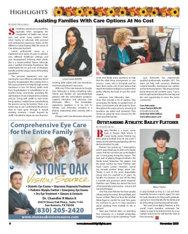 SBy Kathi Holzschuherometimes, experience is everything, especially when navigating the complexities of health care, seniorcare, and senior living options. That’s when having an advocate with personal and professional experience makes all the difference. Laura Daniels, BSN, RN owner of Care Advocates has both.Laura’s professional career as a registered nurse spans 30 years in geriatric care, different healthcare settings, and case management involving older adults. She is a board-certified Patient Advocate and a Certified Dementia Practitioner. She understands the ins and outs of Medicare benefits and the unique needs of the elderly population.The personal experience was eye- opening for Laura. When an older dear friend became incapacitated after surgery from a fall, Laura jumped in to help through several transitions in care. Her friend, Judith, went from hospitalization to rehabilitation to an assisted living community, providing the right balance of care, independence, friends, and joy. “Going with Judith to view senior living options, I realized how overwhelming the process can be for families. There is no better way to say I understand this process than to have gone through it myself, assisting someone I loved. Inspired by Judith I decided to begin my own business,client and family many questions to help find the ideal living arrangement or care services. Laura, who is bi-lingual, and her team then create a list of care options that match the families’budget in a location they prefer, offering the level of care the client requires.However, Care Advocates doesmore than provide a list of options; they accompany the family on guided tours of these communities and advocate for them throughout the entire process, ensuring all questions are asked and answered. They remain an advocate and a resource for the client and their families.Care Advocatesqualified professionals available 24/7. The team can help with resources, Medicare covered benefits, transitional care options and senior living options.“We are passionate about what we do!” exclaims Laura. “I go to bed at night excited about the next day and the next opportunity to serve the senior community.”Care AdvocatesLaura Daniels BSN, RN (210) 669-2222 (Cell) (210) 932-0000 (Office) www.advocatern.comAssisting Families With Care Options At No CostLaura Daniels BSN,RNassisting older adults with care transitions, and senior placement,” says Laura.With over 70 five-star reviews on Google, Care Advocates is doing something right. Clients and families are overwhelmingly pleased with the personalized guidance, support, education, and advocacy Care Advocates offers. This knowledge, experience, guidance is at no cost to families. Care Advocates considers it a lifetime relationship when working with a family.It begins with Care Advocates asking thehas experienced,Comprehensive Eye Care for the Entire Family• Diabetic Eye Exams • Glaucoma Diagnosis/Treatment • Pediatric Myopia Control • Emergency Eye Exams• Dry Eye Treatment • Glasses & ContactsDr. Chandler R Mann II20079 Stone Oak Pkwy., Suite 1104 San Antonio, TX 78258(830) 205-2420www.stoneoakvisionsource.comOutstanding Athlete: Bailey FletcherBy Gretchen Benneailey Fletcher is a senior corner back at Reagan High School. A 3-year Varsity starter, Fletcher hasbeen playing football since he was a kid. “I always loved watching and playing with my dad and brother,” he said.Fletcher has racked up 7 interceptions and 35 pass break-ups to date in his Varsity career. And he’s not done yet as the Rattlers are 7-0 and going strong this season. “The best part of playing Reagan football is the family bond betweeen the players and the great coaches we have,” Fletcher said. Head Coach Lyndon Hamilton cannot say enough positive things about him. “Bailey is one of the most dependable young men I’ve coached in 25 years. He handles his business on and off the field, is humble and possesses great character,” Hamilton said. “Bailey has earned the trust of his teammates and coaches - a trust is still earned at Reagan.”Over the years Fletcher has been greatly influenced by his trainer, Bernard Blake, also known as ‘Bam’. “Bam has been like another father figure in my life,” he said. “He’s given me someone to go to if I have questions about anything from football to life in general.”Next year Fletcher plans on attending Rice University on a football scholarship, hoping to major in sports marketing.“I wantBailey Fletcherto play football as long as I can and then hopefully become a sports agent,” he said. He looks ahead to his future with gratitude, saying he is most thankful for his family and all of the things God has blessed him with.“We need more Bailey Fletchers in this world,” Coach Hamilton continued. “He makes us want to be better for him, he is our Captain and I know he will lead the Owls at Rice University.”4www.stoneoakhighlights.comNovember 2023