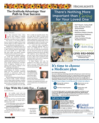 The Gratitude Advantage: Your Path to True SuccessBIy Sonny Melendrezn these fast-paced times, where success often equates to material gain, it’s easy to overlook a potentforce that can transform our lives – gratitude. True success is not merely wealth or fame; it’s about the quality of life we lead and the impact we make. Gratitude is thekey to unlocking this meaningful success. Gratitude isn’t a fleeting emotion; it’s a life-changing practice. Research shows that it offers numerous physical, psychological, and social benefits. It’s a ripple effect that starts within and extends outward,enriching our lives and those around us. First and foremost, gratitude enhances our mental and emotional well-being. Focusing on life’s positives and expressing thanks fosters optimism. It’s no surprise that grateful people experience lower levels of stress, anxiety, and depression, and higher levels of happiness. Gratitude acts as a natural mood enhancer, helping us facelife’s challenges with resilience.Gratitude also strengthens relationships.Acknowledging the kindness of others builds trust and connection, enhancing teamwork in professional settings and personal relationships. It’s a key to success in both spheres.Moreover, gratitude positively influences our physical health. Grateful individuals tend to adopt healthier lifestyles, including exercise and balanced diets. These choices lead to better overall health and longevity.Incorporating gratitude into your dailyThere’s Nothing More Important thanfor Your Loved One• 24/7 Expert, Caring Staff• Safe, Nurturing Serene Environment.• Daily Activities• Nutritious Meals & Snacks• Individualized Wellness Services Plans• Fully Furnished Private Resident Rooms(210) 932-0000Located Across From Hollywood Parkwww.premieralfs.comlife is a simple yet powerful practice. Take time each day to reflect on what you’re thankful for, and keep a gratitude journal. Express appreciation to those around you, both personally and professionally. As you make gratitude a habit, it’ll transform your life and influence those you interact with.In a world that often oversimplifies success, embracing gratitude leads to a richer, more fulfilling life. It’s a reminder that success isn’t solely about achievement but also about the journey. By nurturing gratitude, you’ll pave the way for a life filled with happiness, strong relationships, and genuine success. Take a moment each day to pause, reflect, and be grateful for life’s blessings. Watch as the power of gratitude transforms your path to success.As Maya Angelou once said, “Let gratitude be the pillow upon which you kneel to say your nightly prayer. And let faith be the bridge you build to overcome evil and welcome good.”Sonny Melendrezis an award-winningmotivational speaker,Hall of Fame radio/TV host and author,based in San Antonio.For more of his enthusiastic brand of inspiration and speaking information, visit www.SonnyMelendrez.com and listen to his podcast.It’s time to choose a Medicare planDear Medicare Beneficiary,You want a Medicare Advantage plan that will meet your needs. And since things can change from year to year, it’s a good time to review your needsand think about what kind of benefits you want in 2024. For example, areyou taking any new prescription drugs? Do you have new health goals or challenges? Medicare plans can change from year to year, just like your needs.You don’t have to figure it out all by yourself. Contact me today to:Remove the confusion from MedicareGet help comparing plansReceive one-on-one sales supportSwitch plans with confidenceAs a licensed sales agent, I can answer your questions and help you get ready for the Medicare Annual Enrollment Period, which starts on October 15. I can also help you find out if you qualify to enroll now. Call me today — I look forward to hearing from you.Call me today!Licensed Sales Agent 210-612-5777, TTY 711 calpenab@gmail.com medicaretexasplans.com Sí, hablo su idioma.Plans are insured through UnitedHealthcare Insurance Company or one of its affiliated companies, a Medicare Advantage organization with a Medicare contract and a Medicare- approved Part D sponsor. Enrollment in these plans depends on the plan’s contract renewal with Medicare. ©2023 United HealthCare Services, Inc. All Rights Reserved.Y0066_SPRJ63876_CBertha Eliza CalpenaSPRJ63876I Spy With My Little Eye... ContestBy Alissa ReinhardL ook carefully, search each and every page, up and down, left andright, front to back, and then back to front.Don’t give up! If you can find the hidden pilgrim turkey you’ll be entered into a drawing to win a $50!Just email the page number and location where you spotted the pilgrim turkey to contest@stoneoakhighlights.com.Deadline is November 9, 2023.We hope you’ll have fun with our versionof a mini-scavenger hunt within our pages. Good Luck!Congratulations to our OctoberI Spy winner Mason WardNovember 2023www.stoneoakhighlights.com 5