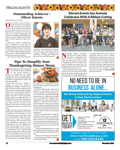 Outstanding Achiever : Oliver KarutzSOu b m i t t e d B y F u s i o n A c a d e m yliver Karutz, a senior student at Fusion Academy, is set to graduate high school two years early inDecember 2024, marking the culmination of an incredible journey. Known for his determination and passion for learning, Oliver has excelled academically and embraced his unique path. After graduation, he plans to attend welding school and then move to Utah to pursue his career in the trade.Beyond his academic achievements, Oliver is dedicated to giving back. He regularly volunteers with his grandmother at homeless shelters, where his commitment to community service shines. In his spare time, he enjoys reading, playing guitar, and writing music—creative outlets that allow him to express himself and unwind.Oliver’s story is a testament to hard work,Elevate Events San Antonio Celebrates With A Ribbon Cuttingcompassion, and pursuing one’s passions, both inside and outside the classroom. His future is bright as he embarks on new adventures in welding and continues his journey of service and self-expression.Northside Business Association and Stone Oak Ladies Business Association congratulated Kiman upstairs loft area that can be used in conjunction with your event if needed. Elevate Events is located on the corner unit of a shopping center with plenty of parking, and easy access from the Highway. Elevate Events San Antonio is centrally located in the heart of the city, to make it easy for you tohostanevent!”Theyarelocatedat15701 San Pedro Ave, San Antonio, TX 78232. They can be reached at (726) 224-0600 and are on Facebook.Tips To Simplify Your TThanksgiving Dinner MenuFolden with her new business Elevate Events San Antonio with a ribbon cutting on September 25, 2024. Kim Folden is also owner of MaidPro San Antonio and is an entrepreneuratheart.TheAssociationslook forward to her growth and success.Elevate Events San Antonio is an indoor venue for all of your event needs. Elevate Events is two stories, providing ample space on the first floor for a large gathering, andhanksgiving is a much anticipated and beloved holiday. Celebrated on the second Monday inOctober in Canada and the fourth Thursday of November in the United States, Thanksgiving in each country offers families and friends an opportunity to gather and break bread together.• Accept help, but keep it limited. It’s customary for loved ones invited to Thanksgiving celebrations to offer to bring a dish to dinner, and that can alleviate some of the work hosts are tasked with managing. However, hosts can keep things simple by asking only a small handful of guests to prepare a side dish. Once the quota is filled, politely decline any additional offers to bring food. It can be hard to find space on the table if too many guests bring dishes from home, and that can lead to hurt feelings if certain sides are ignored or left on the kitchen counter due to a lack of real estate.• Explain your desire to reduce food waste. Another way to simplify the meal is to avoid succumbing to the temptation to cook too much food. Guests may expect to go home with full bellies. Indeed, the Calorie Control Council notes that Americans consume between 3,000 and 4,500 calories during Thanksgiving celebrations. Such consumption is not only unhealthy for humans, but the planet as well. The U.S.- based nonprofit ReFED, which is devoted to stopping food waste, estimated that Americans would waste 312 million pounds of food on Thanksgiving 2023. Hosts who want to avoid cooking excessive amounts of food, much of which may eventually end up in the trash can, can simplify meal prepby cooking less and explaining to guests that they aspire to reduce food waste this Thanksgiving.• Keep table settings simple. Unless you’re planning to post photos of the family meal on Instagram this Thanksgiving, you can skip the more elaborate formal table settings in favor of a simple setup you might use on most nights when dining at home. Polishing the fancy silver and folding cloth napkins in a way that would impress a seasoned maître d’is a time-consuming task that can complicate meal preparation. Keep it simple with less formal settings, which will allow guests to direct their focus to the task at hand: eating a delicious, homecooked holiday meal.• Purchase a premade dessert. It might be tempting to try your hand at a homemade dessert, but it’s far easier to purchase pies and ice cream from a local farmer’s market in the days leading up to Thanksgiving. This approach ensures hosts have it a little easier once the main course has been served and consumed.Hosting Thanksgiving dinner is no small task. However, hosts can take various steps to simplify Thanksgiving meal planning this year.Sticking to Turkey Day standard bearers is not the only way to simplify meal planning on this beloved holiday.No Need To Be InBusiness ALONE...We Bring Networking Opportunities & New PartnershipsGET involvedJoin us!• Collaborate With Like-Minded Business People• Expand Your Business Connections• Peer Supporttoday!• Ribbon Cutting Ceremonies• Networking & Social Events• Establish RelationshipsRegister today for our next event info@northsidebasa.com or call 210-548-644812www.stoneoakhighlights.comNovember 2024