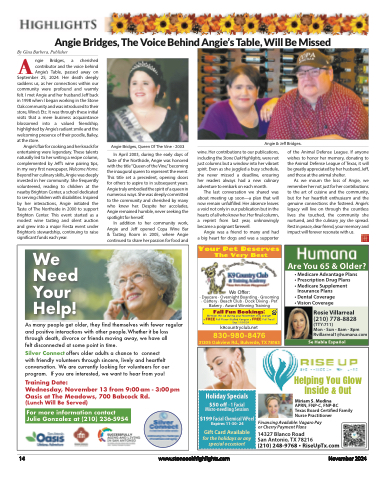 Angie Bridges, The Voice Behind Angie’s Table, Will Be MissedBAy Gina Barbera, Publisherngie Bridges, a cherished contributor and the voice behind Angie’s Table, passed away onSeptember 25, 2024. Her death deeply saddens us, as her connections within our community were profound and warmly felt. I met Angie and her husband Jeff back in 1998 when I began working in the Stone Oak community and was introduced to their store, Wine’s Etc. It was through these initial visits that a mere business acquaintance blossomed into a valued friendship, highlighted by Angie’s radiant smile and the welcoming presence of their poodle, Bailey, at the store.Angie’s flair for cooking and her knack for entertaining were legendary. These talents naturally led to her writing a recipe column, complemented by Jeff’s wine pairing tips, in my very first newspaper, Welcome Home. Beyond her culinary skills, Angie was deeply invested in her community. She frequently volunteered, reading to children at the nearby Brighton Center, a school dedicated to serving children with disabilities. Inspired by her interactions, Angie initiated the Taste of The Northside in 2000 to support Brighton Center. This event started as a modest wine tasting and silent auction and grew into a major Fiesta event under Brighton’s stewardship, continuing to raise significant funds each year.Angie Bridges, Queen Of The Vine - 2003In April 2003, during the early days of Taste of the Northside, Angie was honored with the title “Queen of the Vine,” becoming the inaugural queen to represent the event. This title set a precedent, opening doors for others to aspire to in subsequent years. Angie truly embodied the spirit of a queen in numerous ways. She was deeply committed to the community and cherished by many who knew her. Despite her accolades, Angie remained humble, never seeking the spotlight for herself.In addition to her community work, Angie and Jeff opened Copa Wine Bar & Tasting Room in 2005, where Angie continued to share her passion for food andAngie & Jeff Bridges.wine. Her contributions to our publications, including the Stone Oak Highlights, were not just columns but a window into her vibrant spirit. Even as she juggled a busy schedule, she never missed a deadline, ensuring her readers always had a new culinary adventure to embark on each month.The last conversation we shared was about meeting up soon—a plan that will now remain unfulfilled. Her absence leaves a void not only in our publication but in the hearts of all who knew her. Her final column, a reprint from last year, unknowingly became a poignant farewell.Angie was a friend to many and had a big heart for dogs and was a supporterof the Animal Defense League. If anyone wishes to honor her memory, donating to the Animal Defense League of Texas, it will be greatly appreciated by her husband, Jeff, and those at the animal shelter.As we mourn the loss of Angie, we remember her not just for her contributions to the art of cuisine and the community, but for her heartfelt enthusiasm and the genuine connections she fostered. Angie’s legacy will live on through the countless lives she touched, the community she nurtured, and the culinary joy she spread. Rest in peace, dear friend, your memory and impact will forever resonate with us.We Need Your Help!As many people get older, they find themselves with fewer regular and positive interactions with other people.Whether it be loss through death, divorce or friends moving away, we have allfelt disconnected at some point in time.Silver Connect offers older adults a chance to connect with friendly volunteers through sincere, lively and heartfelt conversation. We are currently looking for volunteers for our program. If you are interested, we want to hear from you!Training Date:Wednesday, November 13 from 9:00 am - 3:00 pm Oasis at The Meadows, 700 Babcock Rd.(Lunch Will Be Served)For more information contact Julie Gonzalez at (210) 236-5954Your Pet Deserves The Very BestAre You 65 & Older?• Medicare Advantage Plans • Prescription Drug Plans• Medicare SupplementInsurance Plans • Dental Coverage • Vision Coverage• Daycare • Overnight Boarding • Grooming • Cattery • Beach Club • Dock Diving • Pet Bakery • Award Winning Trainingk9countryclub.netRosie VillarrealFall Fun Bookings:Mention this ad during your November stay and geta FREE Fall Flavor Stuffed Kong or a FREE Fall Treat! Exp. 11/30/24(210) 778-8828 (TTY:711)Mon - Sun • 8am - 8pm Rvillarreal1@humana.com830-980-8476 31305 Oakview Rd., Bulverde, TX 78163Se Habla EspañolHelping You Glow Inside & OutMiriam S. MedinaAPRN, FNP-C, FNP-BCTexas Board Certified Family Nurse PractitionerFinancing Available: Vagaro Pay or Cherry Payment Plans14327 Blanco RoadSan Antonio, TX 78216(210) 248-9768 • RiseUpTx.comHoliday Specials$50 off - 1 Facial Micro-needling Session$199 Facial Chemical ViPeel Expires 11-30- 24Gift Card Availablefor the holidays or any special occasion!14www.stoneoakhighlights.comNovember 2024
