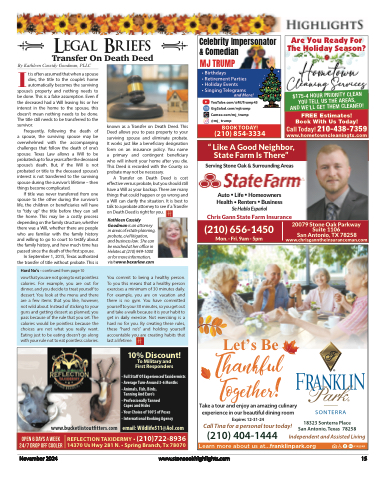 Open 6 Days A Week 24/7 Drop Off CoolerNovember 2024REFLECTION TAXIDERMY • (210)722-8936 14370 Us Hwy 281 N. • Spring Branch, Tx 78070(210) 404-1444 Independent and Assisted LivingLegal BriefsCelebrity Impersonator & ComedianAre You Ready For The Holiday Season?Hometown Cleaning ServicesTransfer On Death DeedMJ TRUMPIBy Kathleen Cassidy Goodman, PLLC• Birthdays• Retirement Parties• Holiday Events• Singing Telegramsand More!YouTube.com/@MJTrump45 GigSalad.com/mjtrump Cameo.com/mj_trump @mj_ trumpBOOK TODAY! (210) 854-3334“ Like A Good Neighbor, State Farm Is There”Serving Stone Oak & Surrounding AreasAuto • Life • Homeowners Health • Renters • Business Se Habla EspañolChris Gann State Farm Insurancet is often assumed that when a spouse dies, the title to the couple’s home automatically becomes the survivingspouse’s property and nothing needs to be done. This is a false assumption. Even if the deceased had a Will leaving his or her interest in the home to the spouse, this doesn’t mean nothing needs to be done. The title still needs to be transferred to the survivor.Frequently, following the death of a spouse, the surviving spouse may be overwhelmed with the accompanying challenges that follow the death of one’s spouse. Texas Law allows a Will to be probated up to four years after the deceased spouse’s death. But, if the Will is not probated or title to the deceased spouse’s interest is not transferred to the surviving spouse during the survivor’s lifetime – then things become complicated.If title was never transferred from one spouse to the other during the survivor’s life, the children or beneficiaries will have to “tidy up” the title before they can sell the home. This may be a costly process depending on the family structure, whether there was a Will, whether there are people who are familiar with the family history and willing to go to court to testify about the family history, and how much time has passed since the death of the first spouse.In September 1, 2015, Texas authorized the transfer of title without probate. This isHard No’s - continued from page 10vow that you are not going to eat pointless calories. For example, you are out for dinner, and you decide to treat yourself to dessert. You look at the menu and there are a few items that you like, however, not wild about. Instead of sticking to your guns and getting dessert as planned; you pass because of the rule that you set. The calories would be pointless because the choices are not what you really want. Eating just to be eating doesn’t go along with your rule not to eat pointless calories.FREE Estimates! Book With Us Today!$175-4 HOUR PRIORITY CLEAN YOU TELL US THE AREAS, AND WE’LL GET THEM CLEANED!www.bucketlistoutfitters.com• Your Choice of 100’S of Poses• International Booking Agencyemail: Wildlife511@Aol.comLet’s BeThankfulTogether!Take a tour and enjoy an amazing culinary experience in our beautiful dining room Expires 12-31-24Call Tina for a personal tour today!18323 Sonterra Place San Antonio, Texas 78258known as a Transfer on Death Deed. This Deed allows you to pass property to your surviving spouse and eliminate probate. It works just like a beneficiary designation form on an insurance policy. You name a primary and contingent beneficiary who will inherit your home after you die. This Deed is recorded with the County so probate may not be necessary.A Transfer on Death Deed is cost effective versus probate, but you should still have a Will as your backup. There are many things that could happen or go wrong and a Will can clarify the situation. It is best to talk to a probate attorney to see if a Transfer on Death Deed is right for you.Kathleen Cassidy Goodman is an attorney in areas of estate planning, probate, civil litigation, andbusinesslaw. Shecan be reached at her office in Helotes at (210) 949-1000 or for more information, visit www.bexarlaw.comYou commit to being a healthy person. To you this means that a healthy person exercises a minimum of 30 minutes daily. For example, you are on vacation and there is no gym. You have committed yourself to your 30 minutes, so you get out and take a walk because it is your habit to get in daily exercise. Not exercising is a hard no for you. By creating these rules, these “hard no’s” and holding yourself accountable you are creating habits that last a lifetime.10% Discount! To Military and First Responders• Full Staff Of Experienced Taxidermists• Average Turn-Around 3-6 Months• Animals, Fish, Birds, Tanning And Euro’s• Professionally Tanned Capes and HidesCall Today! 210-438-7359 www.hometowncleaningtx.com(210) 656-1450Mon.-Fri.9am-5pm20079 Stone Oak Parkway Suite 1106San Antonio, TX 78258 www.chrisganntheinsuranceman.comLearn more about us at...franklinpark.org www.stoneoakhighlights.com 15#142549