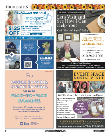 RELAX...we got this!Try MaidPro today and sweep up this exclusive offer:$125 $25 OFF YOUR 2ND, 4TH,AND 6TH CLEANINGSReference Stone Oak Highlights and also receive a FREE Fridge or oven Clean! $50 value.Use Code: SOHL125OFFCall 210-664-4884 or visit maidpro.com/stone-oakyour local geico agent makes bundling simple.Home + Auto = easyLOCAL OFFICERod Musslewhite210-673-2391¡Hablamos Español!Limitations apply. See geico.com for more details. GEICO & affiliates. Washington, DC 20076. GEICO Gecko image © 1999-2022. © 2022 GEICO. 21_633312129MEMBER FDICFor more than 150 years, the way we treat our customers hasn’t changed—even when the way our customers bank with us has.Visit us in Stone Oak at 18762 Stone Oak Pkwy or 21011 US Hwy 281 North or call (210) 220-4011.1/2 HOUR FREE CONSULTATION!Let’s Visit and See How I Can Help You!Call “The Will Lady” Today!The Law Office ofKathleen Cassidy Goodman, PLLC12274 Bandera Rd., Suite 222www.BexarLaw.comHelotes, TX 78023210-949-1000 www.bexarlaw.com25 Years of Legal ExperienceWills • Trusts • Probate • Inheritance • Estate Planning Medical & Financial Power of Attorney • Business Entity FormationWe Offer a Lower Level and Upper Level Space!Space Available For:• Networking events • Mixers• Celebrations• Bridal ShowersEVENT SPACE RENTAL VENUEBook Today! Get 10% OFFOpen 7 days a week!• Baby Showers• Business Meetings• Business Events• Meeting/Training SpaceELEVATE EVENTS • SAN ANTONIO 15701 San Pedro Avenue, San Antonio, TX 78232For more information call (726) 224-06002 www.stoneoakhighlights.com November 2024