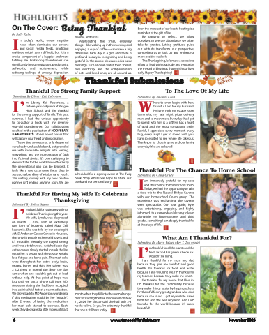On The Cover: Being Thankfuln today’s world, where negative news often dominates our screens and social media feeds, practicinggratitude might seem difficult, but it is a crucial component of a happier and more fulfilling life. Embracing thankfulness can significantly boost motivation, productivity, self-worth, and achievement, while reducing feelings of anxiety, depression,Even the mere act of our hearts beating is a reminder of the gift of life.By pausing to reflect, we allow ourselves to see the abundance we often take for granted. Letting gratitude guide our attitude transforms our perspective, compelling us to look up and embrace a more positive outlook.This Thanksgiving, let’s make a conscious effort to lead with gratitude and recognize the myriad of blessings that enrich our lives daily. Happy Thanksgiving!y Sally KalosBItrauma, and stress.Appreciating the small, everydaythings—like waking up in the morning and enjoying a cup of coffee—can make a big difference. Each day is a gift, and there is profound beauty in recognizing and being grateful for the simple pleasures. Life’s basic blessings, such as clean water, food, shelter, fuel, electricity, and the companionship of pets and loved ones, are all around us.Thankful SubmissionsThankful For Strong Family SupportTo The Love Of My LifeSubmitted By Liberty Keil RobertsonI’for the strong support of family. This past summer, I had the unique opportunity to co-author a book with my seventy- year-old grandmother. Our collaboration resulted in the publication of HOOFBEATS & HEARTBEATS: Stories about horses that will capture your heart and imagination.The writing process not only deepened our already unshakable bond, but provided me with invaluable insights into writing, storytelling, and the incorporation of faith into fictional stories. It’s been satisfying to demonstrate to the world how effortlessly the generational gap can be bridged. It feels like a rare occurrence these days to see such a blending of wisdom and youth. This writing journey with my new creative partner isn’t ending anytime soon. We areSubmitted By Amanda Landm Liberty Keil Robertson, a sixteen-year-old junior at Reagan High School, and I’m thankfulWhere to even begin with how thankful I am for my husband. He is my rock, my escape roomscheduled for a signing event at The Twig Book Shop where we hope to share our book and our personal story.teammate, my late night pizza delivery man, and so much more. Everyday that I get to spend with him is a gift! He has a heart of gold and the most contagious smile. Patrick, I appreciate every moment, every hug, every laugh I get to spend with you. I am so excited to see where life takes us. Thank you for choosing me and our family everyday! You are so loved!Thankful For The Chance To Home Schoola field trip to the Natural Bridge Caverns with our Homeschool Co-op group. The experience was enchanting; the caverns were spectacular. Our tour guide, Kyle, was entertaining, engaging, and highly informed. It’s a tremendous blessing to learn alongside my kindergartener and third grader, something I am deeply thankful for at this stage of life.What Am I Thankful For?Submitted By Clara GradyIam immensely grateful for my sons and the chance to homeschool them.Today, we had the opportunity to takeThankful For Having My Wife To CelebrateSubmitted By Robert MasonThanksgivingI’m thankful for having my wife to celebrate Thanksgiving this year. My wife, Lynda, was diagnosed on March 1, 2024, with an extremely rare form of leukemia called Mast Cell Leukemia. She was told by her oncologist at MD Anderson Cancer Center in Houston, that only 50 people in the world have it and it’s incurable. Mentally she stayed strong and I was a total wreck. I watched each day as the cancer slowly started to suck the life out of her. It began with the steady weight loss, fatigue and bone pain. The mast cells were throughout her entire body, brain, organs, bones and skin. Her spleen was 2 1/2 times its normal size. Soon the day came when she couldn’t get out of bed without help. At that point all hope was lost until we got a phone call from MD Anderson stating she had been accepted into a clinical trial to test a new medication. We drove back to MD Anderson wondering if this medication could be her “miracle”. After 2 weeks of taking the medication her mast cells started to decrease. Each week they decreased a little more until lastSubmitted By Mercy Valdez (Age 7, 2nd grade)6www.stoneoakhighlights.comNovember 2024month when they fell into the normal range. Prior to starting the trial medication on May 21, 2024, her doctor said she had only 2-3 weeks to live. So yes, I’m extremely thankful that she is still here today.wouldn’t be living.I am thankful for my mom and dadbecause they give me comfort and good health! I’m thankful for food and water because I also wouldn’t live. I’m thankful for my teachers because they make me smart.I’m thankful for my house that I live in. I’m thankful for the community because they make things easier by helping others. I’m thankful for my great grandma who died because she is old. I got my middle name from her and she was very kind. And I am thankful for the world because it’s super beautiful!I’m thankful for all the plants and the fresh air God has given us because I