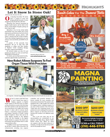 Let It Snow In Stone Oak!OSubmitted By Outside The Boxn Saturday, December 7th, Santa Claus is coming to town and bringing 80,000 pounds of snowstraight from the North Pole with him! WinterFest San Antonio presented by Baptist Health System will be held in the North Central Baptist Hospital parking lotfrom 10am to 3pm.Winterfest is fun for the whole familyand features two snow slides and a snow playing area, performances by local schools and performance groups, photos with Santa, a carnival and lots of kids activities. There’s also holiday shopping from our local artisans, food and drinks and SNOW much more!A portion of the proceeds from WinterFest will go to help kids with disabilities or delays and their families at Brighton Center including therapy, education, support and childcare.All inclusive tickets are only $10 and parents are only $5 so come out and have SNOW MUCH FUN with us!For tickets, sponsorship/vendor booths, volunteer opportunities or performanceBundt Cakes For TheBuy 2 Bundtletsand get one FREE One per visit. Expires 11-30-24Order Online!Stone OakWe Deliver!(210) 495-2253 700 E. Sonterra Blvd NothingBundtCakes.com San Antonio, TX 78258requests, please visit us at:www.winterfestivalsa.comNew Robot Allows Surgeons To Feel Organ Tissue With PrecisionMAGNAPAINTINGYOUR INTERIOR & EXTERIOR PAINTING EXPERTS$100 OFFAny Interior or Exterior Project of $1,000 or more!$200 OFFAny Interior or ExteriorProject of $2,000 or more!Must mention Highlights Newspapers. Call for details. Expires 11/30 /24SCAN or CALL TODAY!(210) 446-5795Dr. Craig See - General Surgeon Baptist Medical Network in the OR with the new da VinciWhat if a robot could feel? Now it can! A brand new robot is helping surgeons at Baptist Health System to feel the tissue of organs as they sit behind a console a few feet away from their patients in the Operating Room. At an investment of $5 million, the newest da Vinci 5 robot, with its sensory touch feature, is improving surgical procedures and patient outcomes at North Central Baptist Hospital in Stone Oak and at St. Luke’s Baptist Hospital in the Medical Center, the first hospitals in the Baptist Health System to acquire this brand new technology with this feature that no other surgical system offers.In addition to the new “touch” function, the da Vinci 5 system offers more than 150 enhancements, including new surgeoncontrollers and powerful vibration and tremor controls for even smoother and more precise movements. The system is also equipped with a high quality and natural 3D imaging system, enabling surgeons to see more as they operate. It has more than 10,000 times the computing power of its predecessor and a redesigned console that allows surgeons to find their best fit for viewing and comfort to fit different body types.“This is just one more way we are demonstrating our commitment to our patients,” said Matt Stone, Baptist Health System Group CEO. “When we equip our surgeons with the latest advances in medicine, we help ensure the best possible care for the people we serve.”November 2024www.stoneoakhighlights.com 7