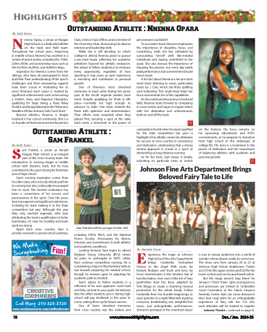 NBy Sally Kalosnenna Opara, a senior at ReaganHigh School, is a dedicated athleteon the track and field team. Throughout her school years, beginning in middle school, Nnenna has excelled in a variety of sprint events, including the 100m, 200m, 400m, and several relay races such as the 4x100m, 4x200m, and 4x400m relays.Inspiration for Nnenna comes from her siblings, who have all participated in track and field. Their understanding of the sport’s challenges and their unwavering support have been crucial in motivating her to excel. Nnenna’s track career is marked by significant achievements such as becoming a District, Area, and Regional Champion, qualifying for State, being a Texas Relay Finalist, and being featured in the “Returners Headline All-San Antonio Girls Track Team.”Beyond athletics, Nnenna is deeply involved in her school community. She is a co-founder of the Environmental AwarenessClub, a Senior Class Officer, and a member of the Chemistry Club, showcasing her diverse interests and leadership skills.While she is still deciding on which college to attend, Nnenna plans to pursue a pre-med major, reflecting her academic ambitions beyond her athletic endeavors. Her advice to fellow students is to embrace every opportunity, regardless of how daunting it may seem, as each experience is enriching and contributes to personal growth.One of Nnenna’s most cherished memories in track came during her junior year at the 4x100 regional prelims track meet. Despite qualifying for finals in 6th place—normally not high enough to advance to state—her team entered the finals with optimism and determination. Their efforts were rewarded when they placed first, securing a spot at the state track meet, a testament to the power ofperseverance and belief.To succeed in track, Nnenna emphasizesthe importance of discipline, focus, and consistency, traits she has cultivated by surrounding herself with like-minded individuals and staying committed to her goals. She also stresses the importance of enjoying the process; not every day yields peak performance, but commitment should never waver.A fun fact about Nnenna is her pre-track meet ritual: listening to music, particularly tracks by J. Cole, which she finds uplifting and motivating. This small ritual helps her focus and reminds her of her capabilities.As she continues her journey in track and field, Nnenna looks forward to competing in more events and hopes to inspire others with her dedication and achievements, both on and off the track.camaraderie he felt when his team qualified for the state competition last year—a highlight of his athletic career. He attributes his success in cross country to consistency and dedication, emphasizing that a strong mental approach is crucial in a sport as demanding as long-distance running.As for fun facts, Sam keeps it simple, indicating no particular news or eventsOutstanding Athlete : Nnenna OparaOutstanding Athlete : Sam Frankelon the horizon. His focus remains on his upcoming educational and ROTC commitments, as he prepares to transition from high school to the challenges of college life. His story is a testament to the power of dedication and the importance of balancing athletics with academic and personal growth.SBy Sally Kalosam Frankel, a senior at Ronald Reagan High School, is an integral part of the cross-country team. Hisintroduction to running began in middle school with distance track, but he truly committed to the sport during his freshman year of high school.Sam’s running inspiration comes from his older sister, who not only introduced him to running but also continually encouraged him to excel. This familial motivation has been a cornerstone of his success and perseverance in the sport. Over the years, Sam has experienced significant milestones, including his team making it to the State competition last year. Although this year they only reached regionals, with Sam attributing the team’s qualification to faster teammates, it’s clear his humility and team spirit are strong.Apart from cross country, Sam is actively involved in several school activities,Johnson Fine Arts Department Brings Beloved Fairy Tale to LifeSam Frankel with his younger brother, Will.including DECA, PALS, and the National Honor Society, showcasing his diverse interests and commitment to both athletic and academic excellence.Looking forward, Sam hopes to attend Brigham Young University (BYU) where he plans to participate in ROTC rather than continue competitive running. He is considering a major in Biochemistry with an eye towards preparing for medical school, though he remains open to adjusting his academic path as needed.Sam’s advice to fellow students is a reflection of his own approach: work hard and fully commit to your goals. He believes that the effort students put in during high school will pay dividends in the years to come, setting them up for future success.One of Sam’s cherished memories from cross country was the elation andEBy Amanda Navarxperience the magic as JohnsonHigh School Fine Arts Departmentbrings Cinderella: Enchanted Version to the stage! With music by Richard Rodgers and book and lyrics by Oscar Hammerstein II, this timeless tale of transformation, love, and a little bit of fairy godmother dust has been adapted by Tom Briggs to create a charming musical production for the whole family. Follow Cinderella from her humble beginnings to royal splendor in a night filled with dazzling costumes, breathtaking sets, delightful live music, and unforgettable performances. Johnson’s portrayal of the cherished classicis sure to sweep audiences into a world of wonder, where dreams really do come true. The show runs from January 24 to 27 at Johnson High School Auditorium. Tickets are $15 for the upper section and $20 for the lower section and can be purchased online.But the magic doesn’t stop there! On January 11 from 10am - 2pm, young princes and princesses are invited to Cinderella’s Court Cor