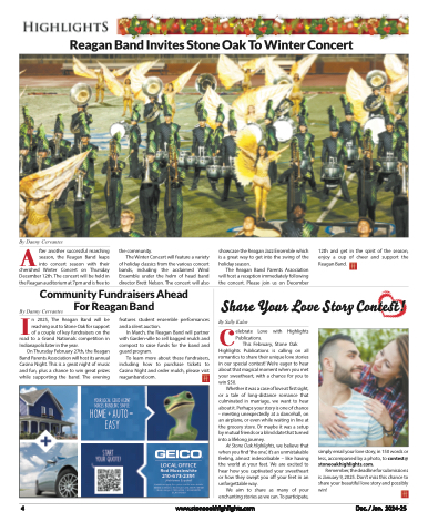 BAy Danny Cervantesfter another successful marchingseason, the Reagan Band leapsinto concert season with their cherished Winter Concert on Thursday December 12th. The concert will be held in the Reagan auditorium at 7pm and is free toCommunity Fundraisers Ahead BIy Danny Cervantes For Reagan Bandthe community.The Winter Concert will feature a varietyof holiday classics from the various concert bands, including the acclaimed Wind Ensemble under the helm of head band director Brett Nelson. The concert will alsoshowcase the Reagan Jazz Ensemble which is a great way to get into the swing of the holiday season.The Reagan Band Parents Association will host a reception immediately following the concert. Please join us on December12th and get in the spirit of the season, enjoy a cup of cheer and support the Reagan Band.n 2025, The Reagan Band will be features student ensemble performances reaching out to Stone Oak for support and a silent auction.of a couple of key fundraisers on the In March, the Reagan Band will partnerShare Your Love Story Contest!simply email your love story, in 150 words or less, accompanied by a photo, to contest@ stoneoakhighlights.com.Remember, the deadline for submissions is January 9, 2025. Don’t miss this chance to share your beautiful love story and possibly win!road to a Grand Nationals competition in Indianapolis later in the year.On Thursday February 27th, the Reagan Band Parents Association will host its annual Casino Night. This is a great night of music and fun, plus a chance to win great prizes while supporting the band. The eveningwith Garden-ville to sell bagged mulch and compost to raise funds for the band and guard program.To learn more about these fundraisers, including how to purchase tickets to Casino Night and order mulch, please visit reaganband.com.BC Publications.This February, Stone Oak Highlights Publications is calling on all romantics to share their unique love stories in our special contest! We’re eager to hear about that magical moment when you met your sweetheart, with a chance for you towin $50.Whether it was a case of love at first sight,or a tale of long-distance romance that culminated in marriage, we want to hear about it. Perhaps your story is one of chance - meeting unexpectedly at a dancehall, on an airplane, or even while waiting in line at the grocery store. Or maybe it was a setup by mutual friends or a blind date that turned into a lifelong journey.At Stone Oak Highlights, we believe that when you find ‘the one’, it’s an unmistakable feeling, almost indescribable – like having the world at your feet. We are excited to hear how you captivated your sweetheart or how they swept you off your feet in an unforgettable way.We aim to share as many of your enchanting stories as we can. To participate,y Sally Kaloselebrate Love with Highlightsyour local geico agent makes bundling simple.Home + Auto = easyLOCAL OFFICERod Musslewhite210-673-2391¡Hablamos Español!Limitations apply. See geico.com for more details. GEICO & affiliates. Washington, DC 20076. GEICO Gecko image © 1999-2022. © 2022 GEICO. 21_6333121294www.stoneoakhighlights.comDec. / Jan. 2024-25