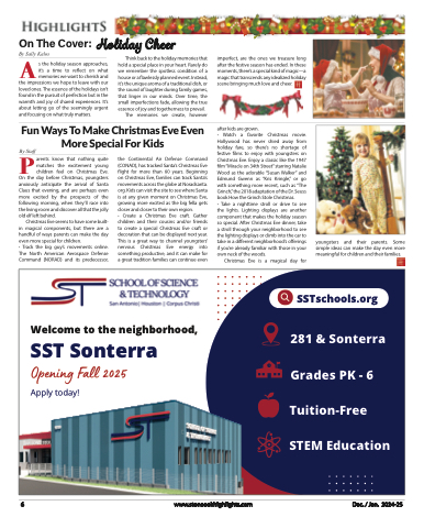 On The Cover: Holiday Cheers the holiday season approaches, it’s a time to reflect on what memories we want to cherish andy Sally KalosBAThink back to the holiday memories that hold a special place in your heart. Rarely do we remember the spotless condition of a house or a flawlessly planned event. Instead, it’s the unique aroma of a traditional dish, or the sound of laughter during family games, that linger in our minds. Over time, the small imperfections fade, allowing the true essence of joy and togetherness to prevail.The memories we create, howeverimperfect, are the ones we treasure long after the festive season has ended. In these moments, there’s a special kind of magic—a magic that transcends any idealized holiday scene bringing much love and cheer.after kids are grown.• Watch a favorite Christmas movie. Hollywood has never shied away from holiday fare, so there’s no shortage of festive films to enjoy with youngsters on Christmas Eve. Enjoy a classic like the 1947 film “Miracle on 34th Street” starring Natalie Wood as the adorable “Susan Walker” and Edmund Gwenn as “Kris Kringle,” or go with something more recent, such as “The Grinch,”the 2018 adaptation of the Dr. Seuss book How the Grinch Stole Christmas.• Take a nighttime stroll or drive to see the lights. Lighting displays are another component that makes the holiday season so special. After Christmas Eve dinner, take a stroll through your neighborhood to see the lighting displays or climb into the car to take in a different neighborhood’s offerings if you’re already familiar with those in your own neck of the woods.Christmas Eve is a magical day forthe impressions we hope to leave with our loved ones. The essence of the holidays isn’t found in the pursuit of perfection but in the warmth and joy of shared experiences. It’s about letting go of the seemingly urgent and focusing on what truly matters.Fun Ways To Make Christmas Eve EvenMore Special For KidsPBy Staffarents know that nothing quite matches the excitement young children feel on Christmas Eve.the Continental Air Defense Command (CONAD), has tracked Santa’s Christmas Eve flight for more than 60 years. Beginning on Christmas Eve, families can track Santa’s movements across the globe at Noradsanta. org. Kids can visit the site to see where Santa is at any given moment on Christmas Eve, growing more excited as the big fella gets closer and closer to their own region.• Create a Christmas Eve craft. Gather children and their cousins and/or friends to create a special Christmas Eve craft or decoration that can be displayed next year. This is a great way to channel youngsters’ nervous Christmas Eve energy into something productive, and it can make for a great tradition families can continue evenOn the day before Christmas, youngsters anxiously anticipate the arrival of Santa Claus that evening, and are perhaps even more excited by the prospects of the following morning, when they’ll race into the living room and discover all that the jolly old elf left behind.Christmas Eve seems to have some built- in magical components, but there are a handful of ways parents can make the day even more special for children.• Track the big guy’s movements online. The North American Aerospace Defense Command (NORAD) and its predecessor,youngsters and their parents. Some simple ideas can make the day even more meaningful for children and their families.Welcome to the neighborhood,SST SonterraOpening Fall 2025Apply today!SSTschools.org281 & SonterraGrades PK - 6 Tuition-Free STEM Education6www.stoneoakhighlights.comDec. / Jan. 2024-25