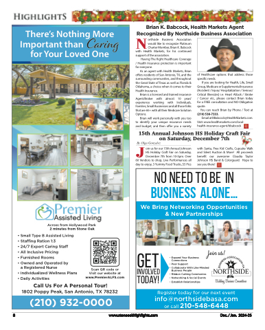 Brian K. Babcock, Health Markets Agent NRecognized By Northside Business Associationorthside Business Association would like to recognize Platinum Charter Member, Brian K. Babcockwith Health Markets, for his continued support of the association.Having The Right Healthcare Coverage / Health Insurance protection is important for everyone.As an agent with Health Markets, Brian offers residents of San Antonio, TX, and the surrounding communities, and throughout the Great State of Texas as well as Florida & Oklahoma, a choice when it comes to their Health Insurance.Brian is a licensed and trained insurance Agent/Broker with almost 10 years’ experience working with Individuals, Families, Small Businesses and all those folks that are 65+ with all their Medicare Solution Options.Brian will work personally with you too to identify your unique insurance needs and budget, and then offer you a varietyThere’s Nothing More Important than Caring for Your Loved OneAcross from Hollywood Park2 minutes from Stone Oak• Small Type B Assisted Living• Staffing Ration 1:3• 24/7 Expert Caring Staff• All Inclusive Pricing• Furnished Rooms• Owned and Operated by a Registered Nurse• Individualized Wellness Plans• Daily ActivitiesScan QR code or Visit our website at www.PremierALFS.comCall Us For A Personal Tour!1802 Poppy Peak, San Antonio, TX 78232(210) 932-000015th Annual Johnson HS Holiday Craft Fair on Saturday, December 7thJBy Olga Gonzalezoin us for our 15th Annual Johnson HS Holiday Craft Fair on Saturday, December 7th from 10-3pm. Over60 Vendors to shop, Live Performances all day to enjoy, 3 Yummy Food Trucks, $5 Picsof Healthcare options that address those specific needs.If you are looking for Health, Life, Small Group, Medicare or Supplemental Insurance (Accident / Injury/ Hospitalization / Serious/ Critical Illness(es) i.e. Heart Attack / Stroke / Cancer etc., please contact Brian today for a FREE consultation and NO-Obligation quote.You can reach Brian by Phone / Text at(210) 538-7333.Email at BBabcock@HealthMarkets.com. Visit: www.healthmarkets.com/local- health-insurance-agent/bbabcockwith Santa, Free Kid Crafts, Cupcake Walk and Silent Auction & More! All proceeds benefit our awesome Claudia Taylor Johnson HS Band & Colorguard. Hope to see you there!No Need To Be InBusiness ALONE...We Bring Networking Opportunities & New PartnershipsGET involvedJoin us!• Collaborate With Like-Minded Business People• Expand Your Business Connections• Peer Supporttoday!• Ribbon Cutting Ceremonies• Networking & Social Events• Establish RelationshipsRegister today for our next event info@northsidebasa.com or call 210-548-64488 www.stoneoakhighlights.comDec. / Jan. 2024-25