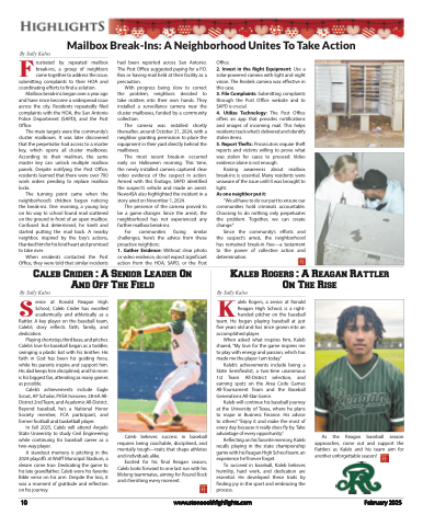 FBy Sally Kalosrustrated by repeated mailboxbreak-ins, a group of neighborscame together to address the issue, submitting complaints to their HOA and coordinating efforts to find a solution.Mailbox break-ins began over a year ago and have since become a widespread issue across the city. Residents repeatedly filed complaints with the HOA, the San Antonio Police Department (SAPD), and the Post Office.The main targets were the community’s cluster mailboxes. It was later discovered that the perpetrator had access to a master key, which opens all cluster mailboxes. According to their mailman, the same master key can unlock multiple mailbox panels. Despite notifying the Post Office, residents learned that there were over 700 work orders pending to replace mailbox locks.The turning point came when the neighborhood’s children began noticing the break-ins. One morning, a young boy on his way to school found mail scattered on the ground in front of an open mailbox. Confused but determined, he knelt and started putting the mail back. A nearby neighbor, inspired by the boy’s actions, thanked him for his kind heart and promised to take over.When residents contacted the Post Office, they were told that similar incidentshad been reported across San Antonio. The Post Office suggested paying for a P.O. Box or having mail held at their facility as a precaution.With progress being slow to correct the problem, neighbors decided to take matters into their own hands. They installed a surveillance camera near the cluster mailboxes, funded by a community collection.The camera was installed shortly thereafter, around October 21, 2024, with a neighbor granting permission to place the equipment in their yard directly behind the mailboxes.The most recent break-in occurred early on Halloween morning. This time, the newly installed camera captured clear video evidence of the suspect in action. Armed with this footage, SAPD identified the suspect’s vehicle and made an arrest. News4SA also highlighted the incident in a story aired on November 1, 2024.The presence of the camera proved to be a game-changer. Since the arrest, the neighborhood has not experienced any further mailbox break-ins.For communities facing similar challenges, here’s the advice from these proactive neighbors:1. Gather Evidence: Without clear photo or video evidence, do not expect significant action from the HOA, SAPD, or the PostOffice.2. Invest in the Right Equipment: Use a solar-powered camera with light and night vision. The Reolink camera was effective in this case.3. File Complaints: Submitting complaints through the Post Office website and to SAPD is crucial.4. Utilize Technology: The Post Office offers an app that provides notifications and images of incoming mail. This helps residents track what’s delivered and identify stolen items.5. Report Thefts: Prosecutors require theft reports and victims willing to prove what was stolen for cases to proceed. Video evidence alone is not enough.Raising awareness about mailbox break-ins is essential. Many residents were unaware of the issue until it was brought to light.As one neighbor put it:“We all have to do our part to ensure our communities hold criminals accountable. Choosing to do nothing only perpetuates the problem. Together, we can create change.”Since the community’s efforts and the suspect’s arrest, the neighborhood has remained break-in free—a testament to the power of collective action and determination.Kaleb Rogers : A Reagan RattlerMailbox Break-Ins: A Neighborhood Unites To Take ActionCaleb Crider : A Senior Leader OnSBy Sally Kalosenior at Ronald Reagan High School, Caleb Crider has excelled academically and athletically as aRattler. A key player on the baseball team, Caleb’s story reflects faith, family, and dedication.Playing shortstop, third base, and pitcher, Caleb’s love for baseball began as a toddler, swinging a plastic bat with his brother. His faith in God has been his guiding force, while his parents inspire and support him. His dad keeps him disciplined, and his mom is his biggest fan, attending as many games as possible.Caleb’s achievements include Eagle Scout, AP Scholar, PVSA honoree, 28-6A All- District 2nd Team, and Academic All-District. Beyond baseball, he’s a National Honor Society member, FCA participant, and former football and basketball player.In fall 2025, Caleb will attend Angelo State University to study Civil Engineering while continuing his baseball career as a two-way player.A standout memory is pitching in the 2024 playoffs at Wolff Municipal Stadium, a dream come true. Dedicating the game to his late grandfather, Caleb wore his favorite Bible verse on his arm. Despite the loss, it was a moment of gratitude and reflection on his journey.KBy Sally Kalosaleb Rogers, a senior at Ronald Reagan High School, is a right- handed pitcher on the baseballteam. He began playing baseball at just five years old and has since grown into an accomplished player.When asked what inspires him, Kaleb shared, “My love for the game inspires me to play with energy and passion, which has made me the player I am today.”Kaleb’s achievements include being a State Semifinalist, a two-time unanimous 1st Team All-District selection, and earning spots on the Area Code Games All-Tournament Team and the Baseball Generations All-Star Game.Kaleb will continue his baseball journey at the University of Texas, where he plans to major in Business Finance. His advice to others? “Enjoy it and make the most of every day because it really does fly by. Take advantage of every opportunity.”Reflecting on his favorite memory, Kaleb recalls playing in the state championship game with his Reagan High School team, an experience he’ll never forget.To succeed in baseball, Kaleb believes humility, hard work, and dedication are essential. He developed these traits by finding joy in the sport and embracing the process.As theapproaches, come out and support the Rattlers