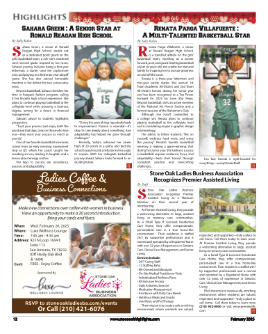 Sahara Green : A Senior Star at Ronald Reagan High SchoolRenata Parga Villafuerte :A Multi-Talented Basketball StarSBy Sally Kalosahara Green, a senior at Ronald Reagan High School, stands out as a dedicated point guard on thegirls’ basketball team, a role she’s mastered since second grade. Inspired by her mom, Sahara’s journey includes being a four-year letterman, a starter since her sophomore year, and playing in a freshman-year playoff game. She has also earned honorable mention in her district for two consecutive years.Beyond basketball, Sahara cherishes her time in Reagan’s fashion program, calling it her favorite high school experience. She plans to continue playing basketball at the collegiate level while pursuing a business degree, aiming for a future in financial management.Sahara’s advice to students highlights perspective:“Trust your process and enjoy both the good and bad days. Lean on those who love you—they want your success as much as you do.”One of her favorite basketball memories comes from an early morning tournament stop at QT, where her coach caught her sneaking an Icee, leading to laughter and a lesson about energy crashes.Her keys to success are consistency, passion, and adaptability:“Doing the same things repeatedly leads to improvement. Passion is essential—it’s okay to care deeply about something. And adaptability has helped me grow through challenges.”Recently, Sahara achieved her career high of 20 points in a game and tied the school’s assist record, a milestone she’s eager to surpass. With her collegiate basketball journey ahead, Sahara looks forward to an exciting future.RBy Sally Kalosenata Parga Villafuerte, a senior at Ronald Reagan High School, is a standout athlete on the girls’basketball team, excelling as a power forward, post, and guard. Starting basketball at just six years old, she credits her dad and family for inspiring her to pursue greatness on and off the court.Renata is a three-year letterman and two-year varsity starter. She earned 1st Team Academic All-District and 2nd Team All-District honors during her junior year and has been recognized as a Top Power Forward for 2025 by Lone Star Preps. Beyond basketball, she’s an active member of the National Art Honor Society and a former treasurer of the Alzheimer’s Club.Although she hasn’t committed to a college yet, Renata plans to continue playing basketball at the collegiate level and is considering majors in graphic design or kinesiology.Her advice to fellow students: “Bet on yourself, embrace hard work, and enjoy the journey.” Renata’s favorite basketball memory is making a game-winning shot during her junior year. She believes success in basketball requires resilience, focus, and adaptability—traits she’s honed through consistent practice and overcoming challenges.Fun fact: Renata is right-handed for everything—except basketball!Business ConnectionsHave an opportunity to make a 30 second introduction.By StaffStone Oak Ladies Business Association Recognizes Premier Assisted LivingWhen: Wed. February 26, 2025 Where: Luxe Wellness Lounge Time: 7:45 am - 9:30 am Address: 923 N Loop 1604 EMember on their second year of membership.At Premier Assisted Living, they provide a welcoming alternative to large, assisted living or memory care communities. As a Small Type B Licensed Residential Care Home, they offer compassionate, personalized care in a true home-like environment. Their residence is staffed 24/7 by supportive professionals and is owned and operated by a Registered Nurse with over 32 years of experience in Geriatric Care, Clinical Case Management, and Senior Living.Services Include:• 24/7 Caring Staff• 1:3 Staffing Ratio• RN-Owned and Managed• On-Site Medical Practitioner Visits• Individualized Wellness Plans• All-Inclusive Pricing• Daily Activities, Exercise• Medication Management• Assistance with Daily Care Needs• Nutritious Meals and Snacks• Live Music and Pet TherapyTheir mission is to create a safe, enriching environment where residents are valued,respected, and supported—truly a place to call home. Call them today to learn more. At Premier Assisted Living, they provide a welcoming alternative to large, assisted living or memory care communities.As a Small Type B Licensed Residential Care Home, they offer compassionate, personalized care in a true home-like environment. Their residence is staffed 24/7 by supportive professionals and is owned and operated by a Registered Nurse with over 32 years of experience in Geriatric Care, Clinical Case Management, and Senior Living.Their mission is to create a safe, enriching environment where residents are valued, respected, and supported—truly a place to call home. Call them today to learn more (210) 932-0000 or visit www.premieralfs. com.Cost:Suite 113San Antonio, TX 78232& 1604) Sponsored By12www.stoneoakhighlights.comFebruary 2025RSVP to stoneoakladiesba.com/eventsOr Call (210) 421-6076ASSOCIATIONStone Oak Ladies Business Association recognizes Premier Assisted Living as a Platinum