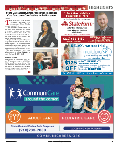 Stone Oak Ladies Business Association Recognizes Care Advocates- Care Options Senior PlacementTBy Staffgoing on its second year.Care Advocates provides health careand senior living resources. They provide families with resources and care options to remain at home. When that is not possible, they assist in helping them finding residential care homes, assisted living and memory care communities.They meet with every family they serve. They assess and provide options based on budget, location, care needs and unique situations. They accompany families to tour these options. They provide education, support, and guidance through this process.For more information, visit www. advocatern.com or call (210) 932-000 or reach directly at (210) 669-2222.About the founder:Laura Daniels is a Registered Nurse with over 30 years of experience in Geriatric Care, Clinical Case Management and Senior Living. She understands transitions in care and the care needs of our older population. Her expert guidance and personalized services are at no cost to the families and clients she serves.he Stone Oak Ladies Business Association recognizes Care Advocates as a Platinum Member“ Like A Good Neighbor, State Farm Is There”Serving Stone Oak & Surrounding AreasAuto • Life • Homeowners Health • Renters • Business Se Habla EspañolChris Gann State Farm Insurance(210) 656-1450Mon. - Fri. 9am - 5pmRELAX...we got this!Try MaidPro today and sweep up this exclusive offer:$125 $25 OFF YOUR 2ND, 4TH,AND 6TH CLEANINGSReference Stone Oak Highlights and also receive a FREE Fridge or oven Clean! $50 value.Use Code: SOHL12520079 Stone Oak Parkway Suite 1106San Antonio, TX 78258 www.chrisganntheinsuranceman.comOFFCall 210-664-4884 or visit maidpro.com/stone-oakFebruary 2025www.stoneoakhighlights.com 15