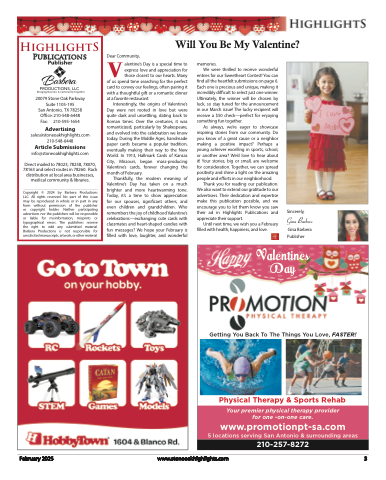 HighlightSPublications PublisherPRODUCTIONS, LLCBringing Business & Community Together20079 Stone Oak Parkway Suite 1105-195San Antonio, TX 78258 Office: 210-548-6448 Fax: 210-595-1654Advertisingsales@stoneoakhighlights.com 210-548-6448Article Submissionsinfo@stoneoakhighlights.comDirect mailed to 78023, 78258, 78070, 78163 and select routes in 78260. Rack distribution at local area businesses, medical community & libraries.Copyright © 2024 by Barbera Productions LLC. All rights reserved. No part of this issue may be reproduced in whole or in part in any form without permission of the publisher or copyright holder. Neither participating advertisers nor the publishers will be responsible or liable for misinformation, misprints or typographical errors. The publishers reserve the right to edit any submitted material. Barbera Productions is not responsible for unsolicited manuscripts, artwork, or other material.DVear Community,alentine’s Day is a special time to express love and appreciation for those closest to our hearts. Manyof us spend time searching for the perfect card to convey our feelings, often pairing it with a thoughtful gift or a romantic dinner at a favorite restaurant.Interestingly, the origins of Valentine’s Day were not rooted in love but were quite dark and unsettling, dating back to Roman times. Over the centuries, it was romanticized, particularly by Shakespeare, and evolved into the celebration we know today. During the Middle Ages, handmade paper cards became a popular tradition, eventually making their way to the New World. In 1913, Hallmark Cards of Kansas City, Missouri, began mass-producing Valentine’s cards, forever changing the month of February.Thankfully, the modern meaning of Valentine’s Day has taken on a much brighter and more heartwarming tone. Today, it’s a time to show appreciation for our spouses, significant others, and even children and grandchildren. Who remembers the joy of childhood Valentine’s celebrations—exchanging cute cards with classmates and heart-shaped candies with fun messages? We hope your February is filled with love, laughter, and wonderfulmemories.We were thrilled to receive wonderfulentries for our Sweetheart Contest! You can find all the heartfelt submissions on page 6. Each one is precious and unique, making it incredibly difficult to select just one winner. Ultimately, the winner will be chosen by luck, so stay tuned for the announcement in our March issue! The lucky recipient will receive a $50 check—perfect for enjoying something fun together.As always, we’re eager to showcase inspiring stories from our community. Do you know of a great cause or a neighbor making a positive impact? Perhaps a young achiever excelling in sports, school, or another area? We’d love to hear about it! Your stories, big or small, are welcome for consideration. Together, we can spread positivity and shine a light on the amazing people and efforts in our neighborhood.Thank you for reading our publication. We also want to extend our gratitude to our advertisers. Their dedication and expertise make this publication possible, and we encourage you to let them know you saw their ad in Highlights Publications and appreciate their support.Until next time, we wish you a February filled with health, happiness, and love.Sincerely,Gina BarberaGina Barbera PublisherWill You Be My Valentine?Valentines DayGetting You Back To The Things You Love, FASTER!Physical Therapy & Sports RehabYour premier physical therapy provider for one -on-one care.www.promotionpt-sa.com5 locations serving San Antonio & surrounding areas210-257-8272February 2025www.stoneoakhighlights.com3